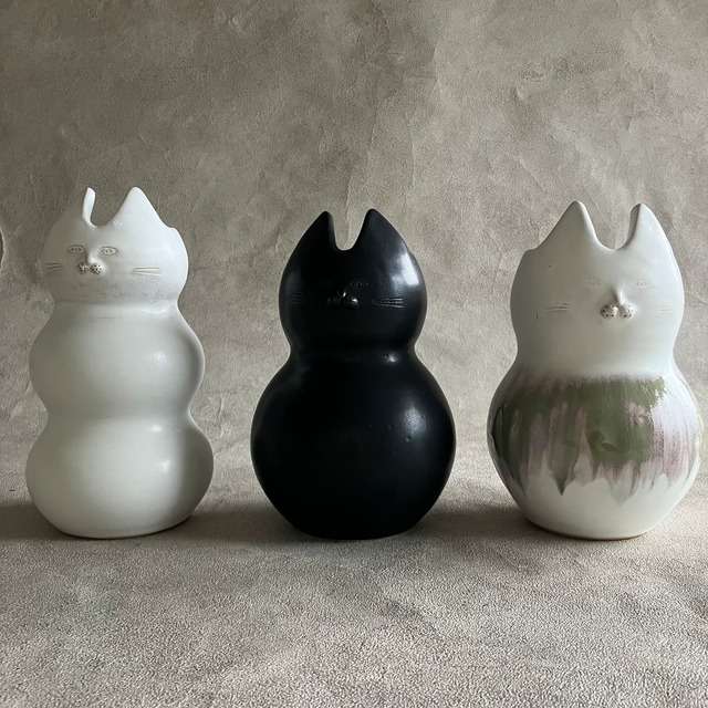 ぽってりとしたフォルムが可愛い猫ちゃんの花器です。 そのまま飾っても、お花を生けても素敵な空間になること間違いなしです☆ 左から 2-A 高さ 約17cm 口径9cm 2-B 約16cm 6cm 2-C 約16cm 7cm