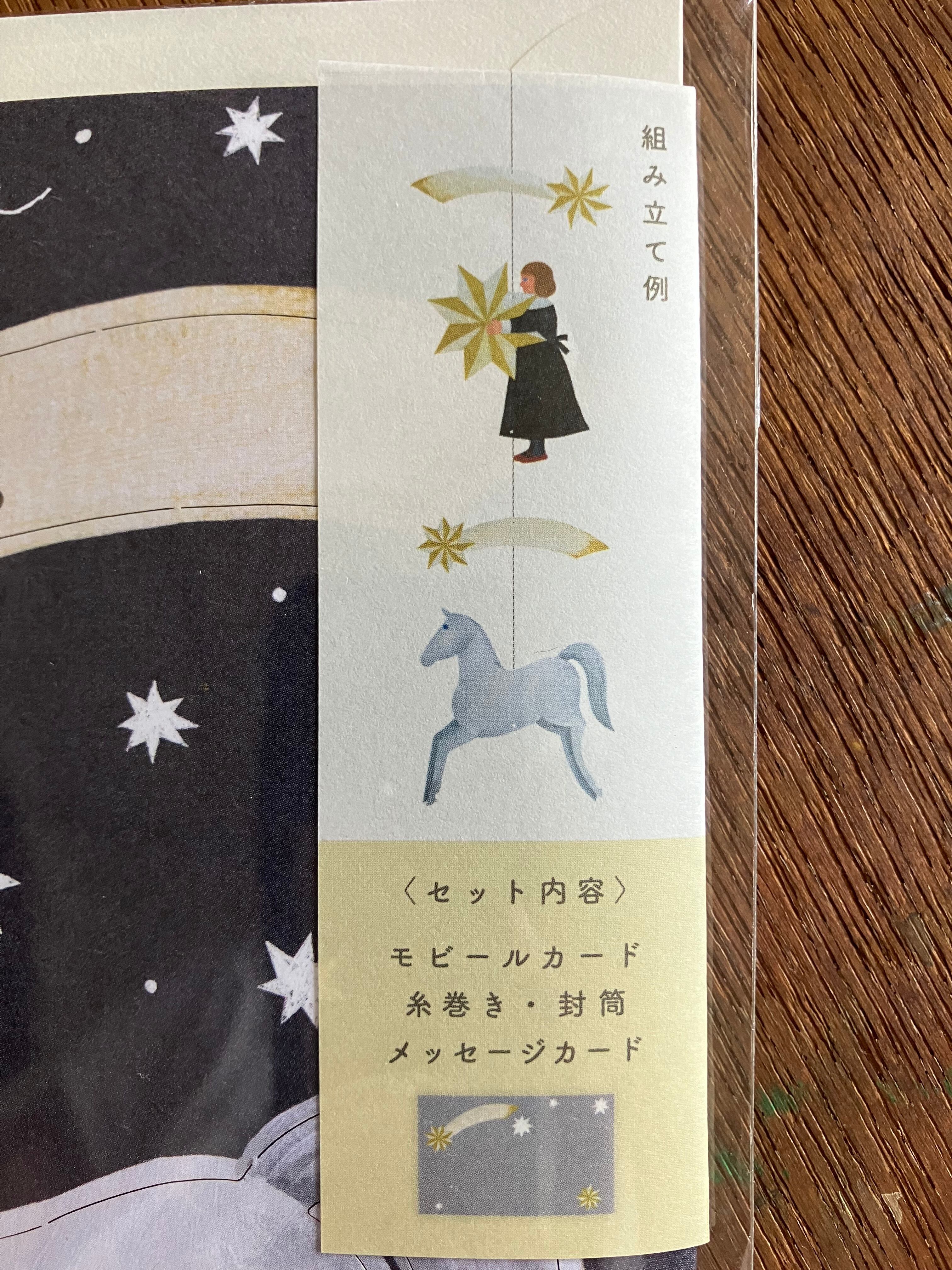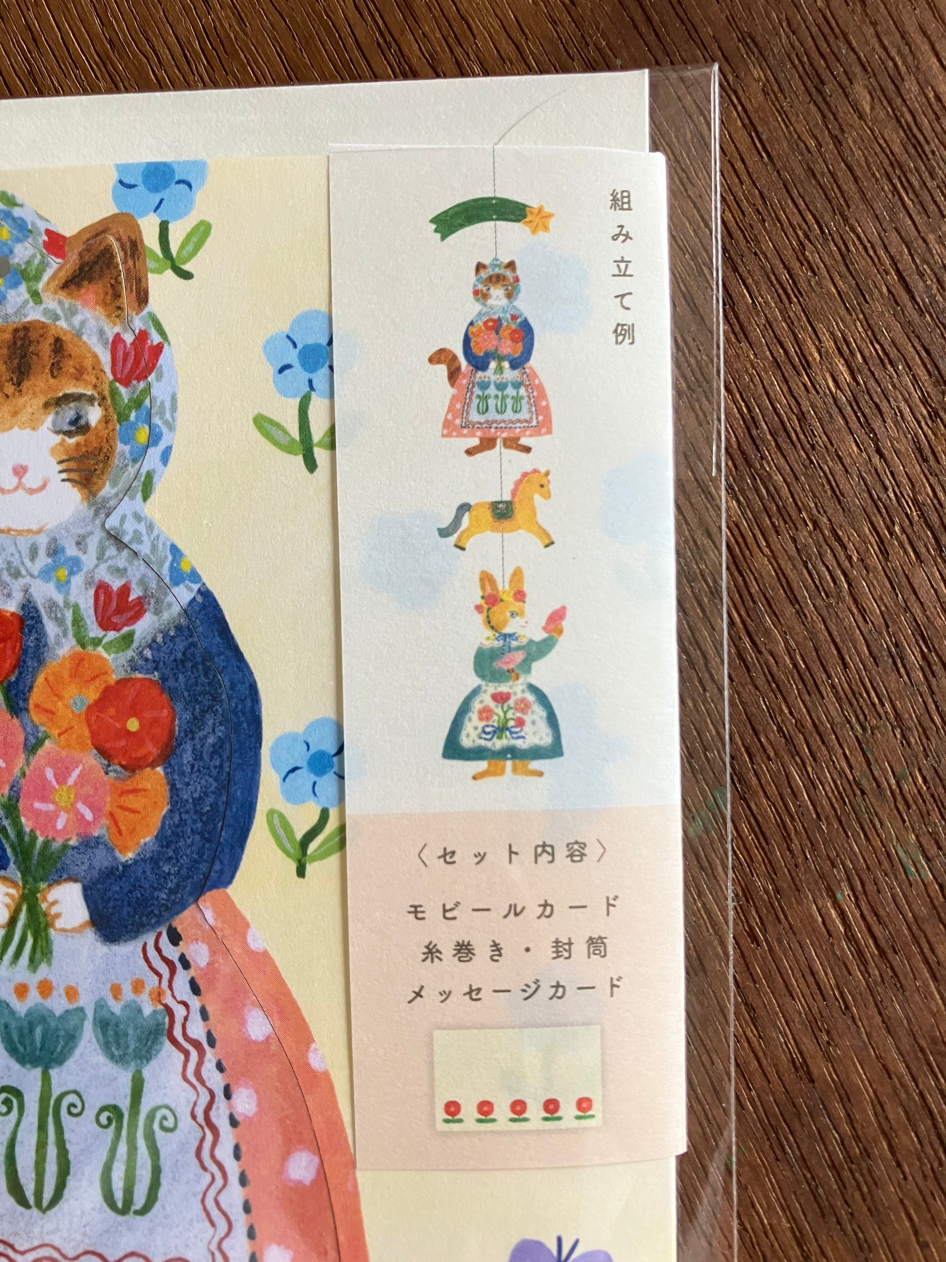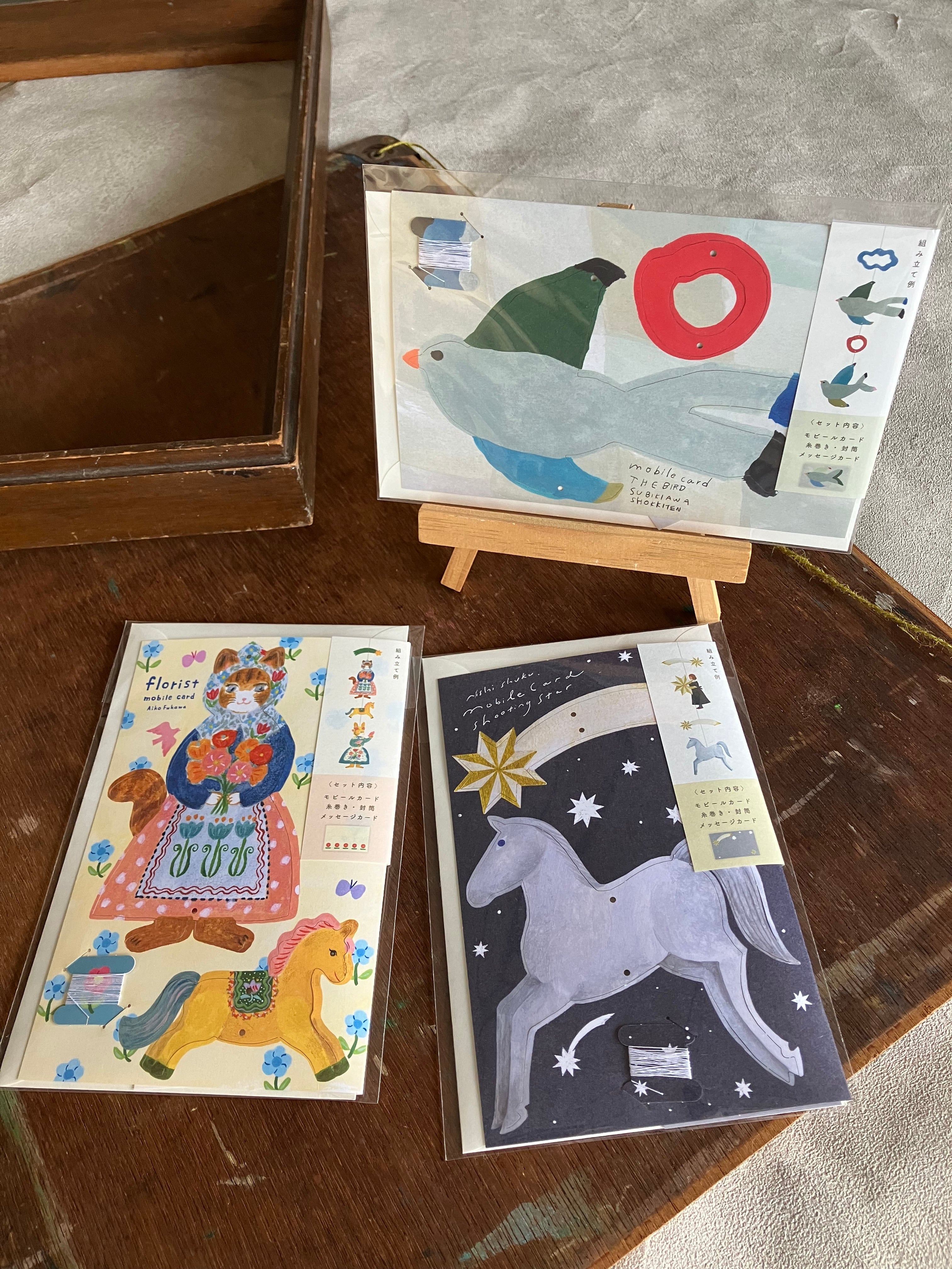 切れ込み入りの台紙からパーツを外して穴に付属の糸を通して結べば、簡単にかわいいモビールの出来上がり!メッセージカードと封筒がついているので、定型郵便で送ることもできますよ。