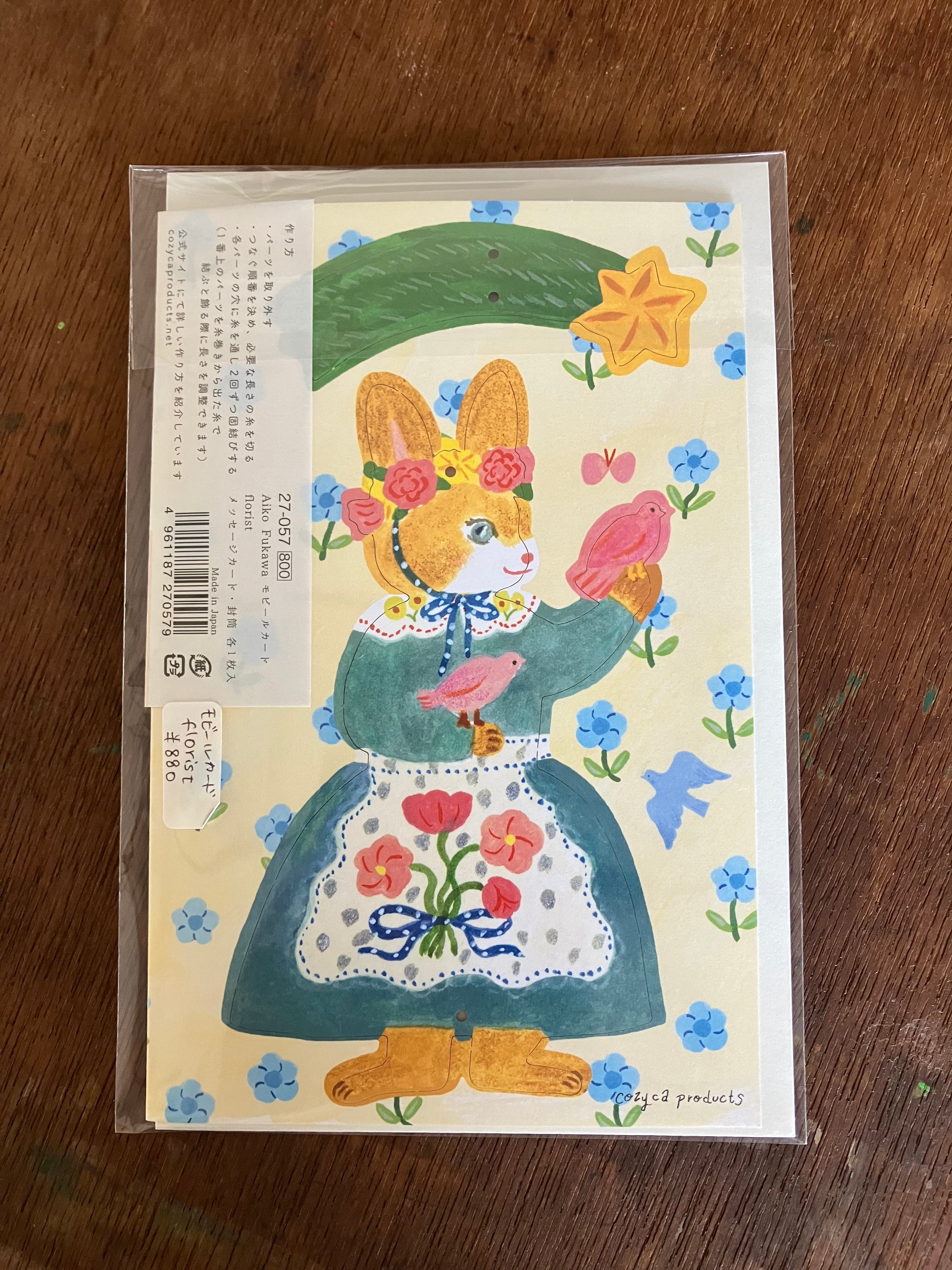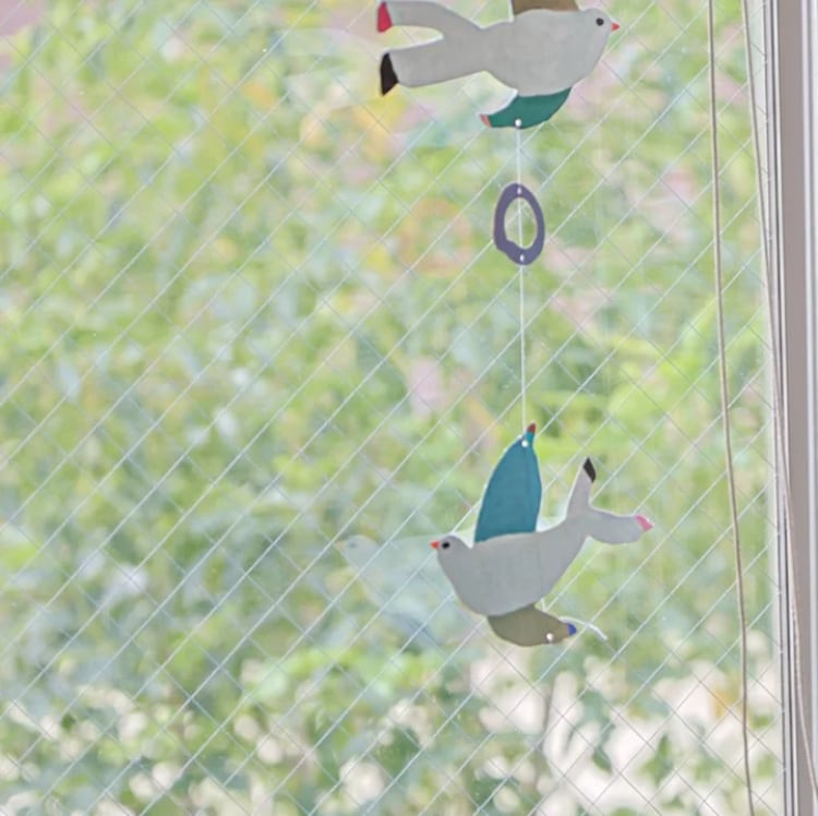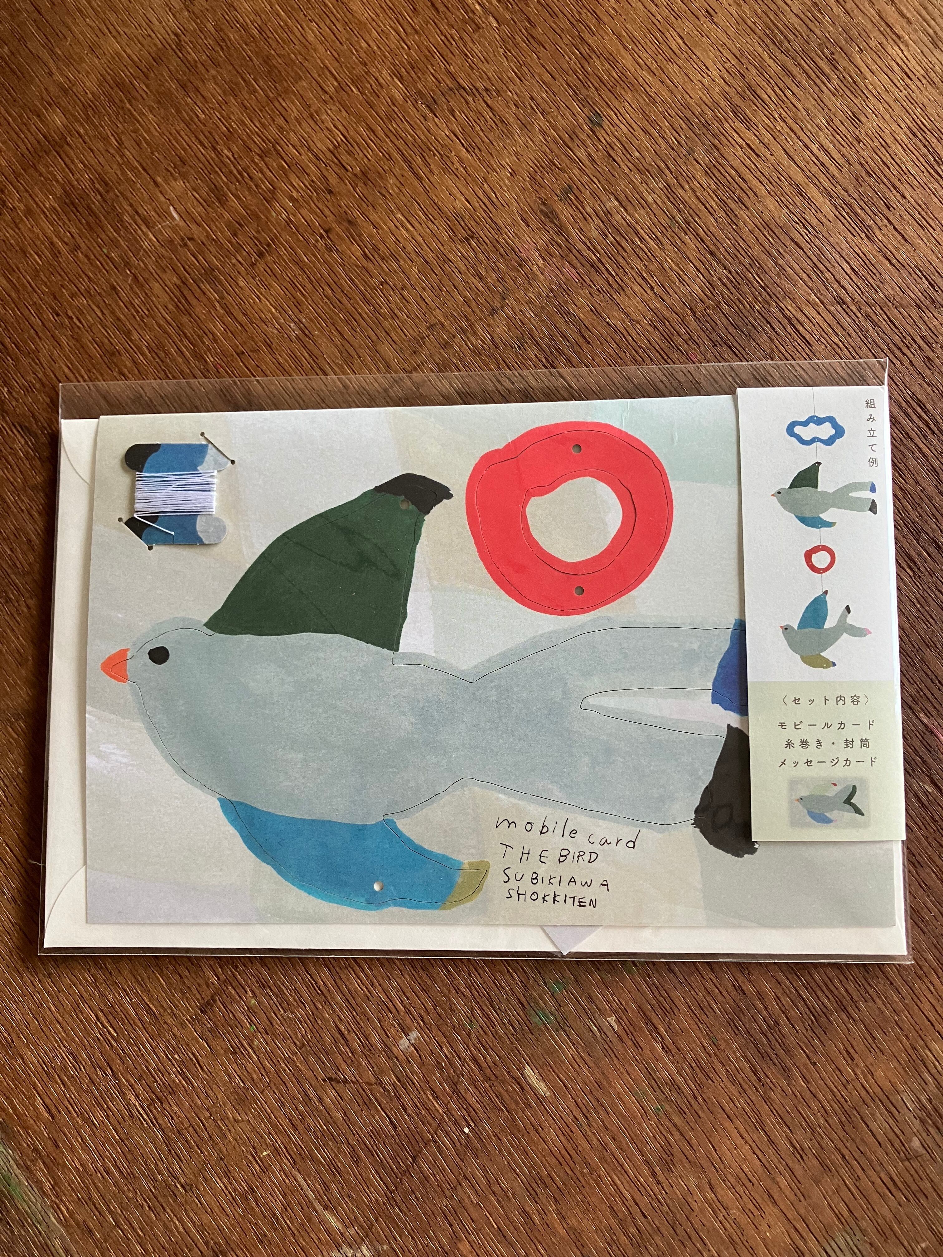 切れ込み入りの台紙からパーツを外して穴に付属の糸を通して結べば、簡単にかわいいモビールの出来上がり!メッセージカードと封筒がついているので、定型郵便で送ることもできますよ。
