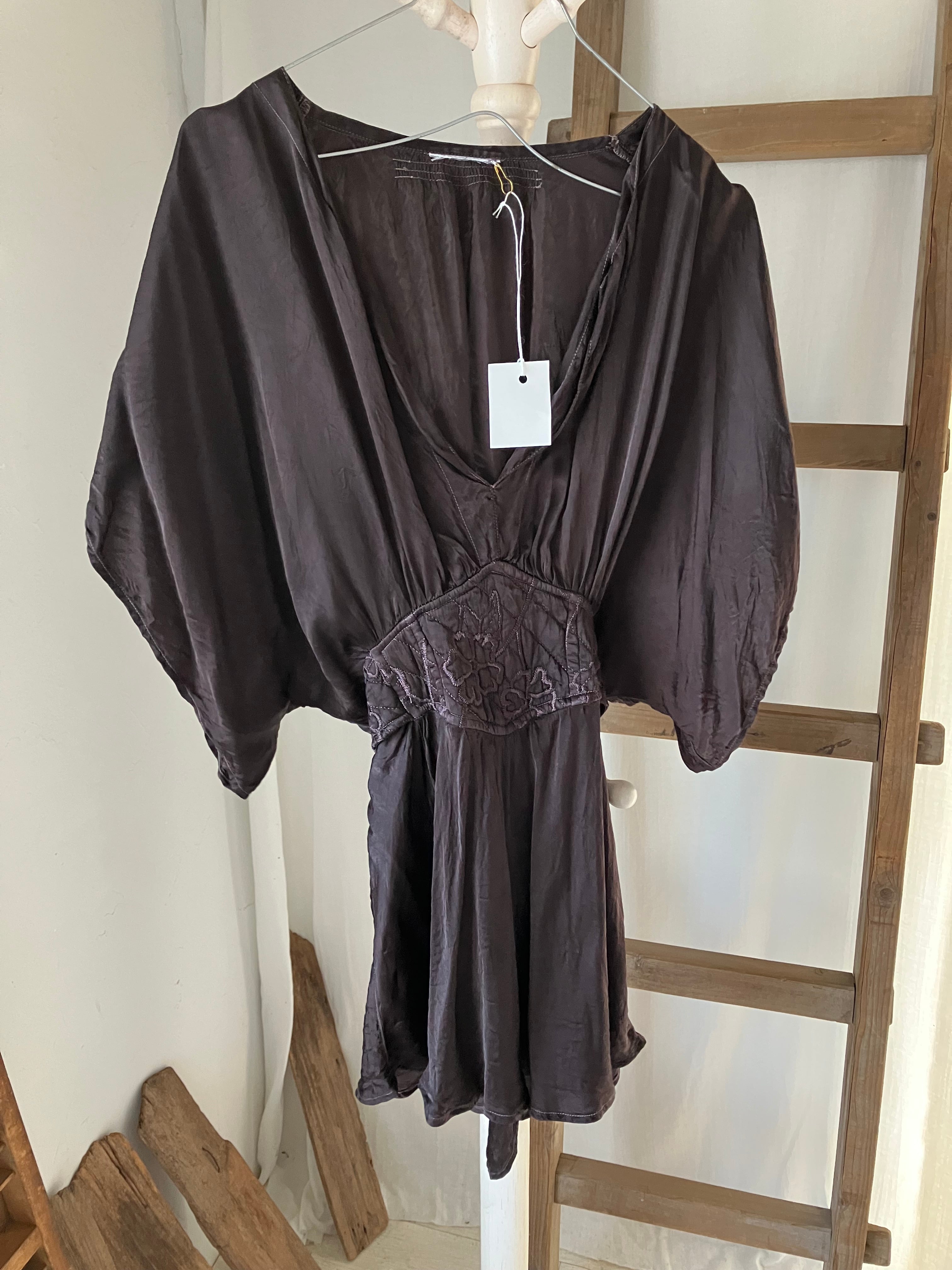 落ち着いたブラウンカラーに、ウエストリボンが施されたリメイクデザインのTシャツ。