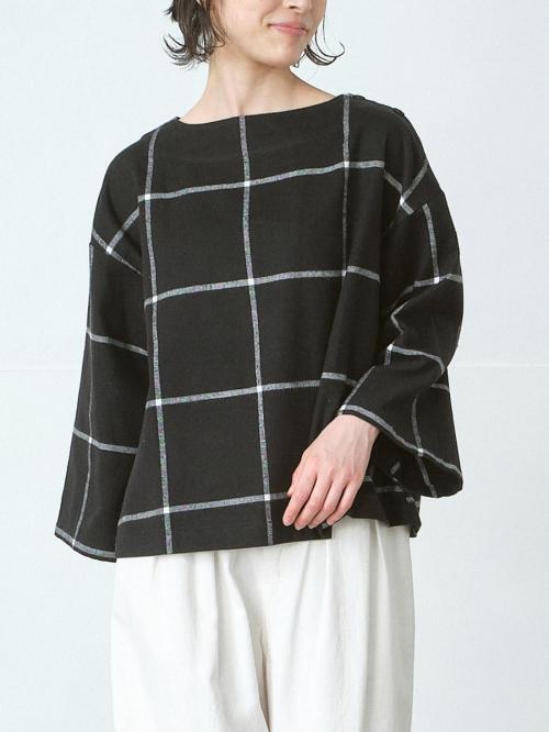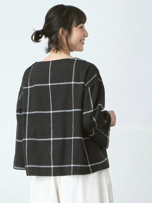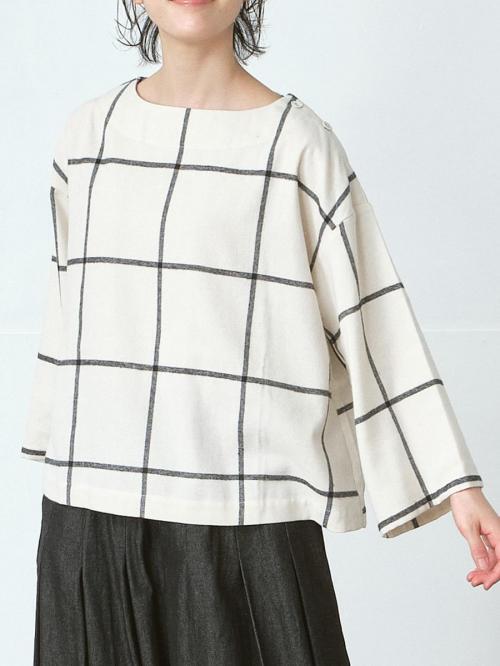 大柄のウインドウペンチェック柄と左肩にくるみボタン2つのボートネックで華奢見え♪