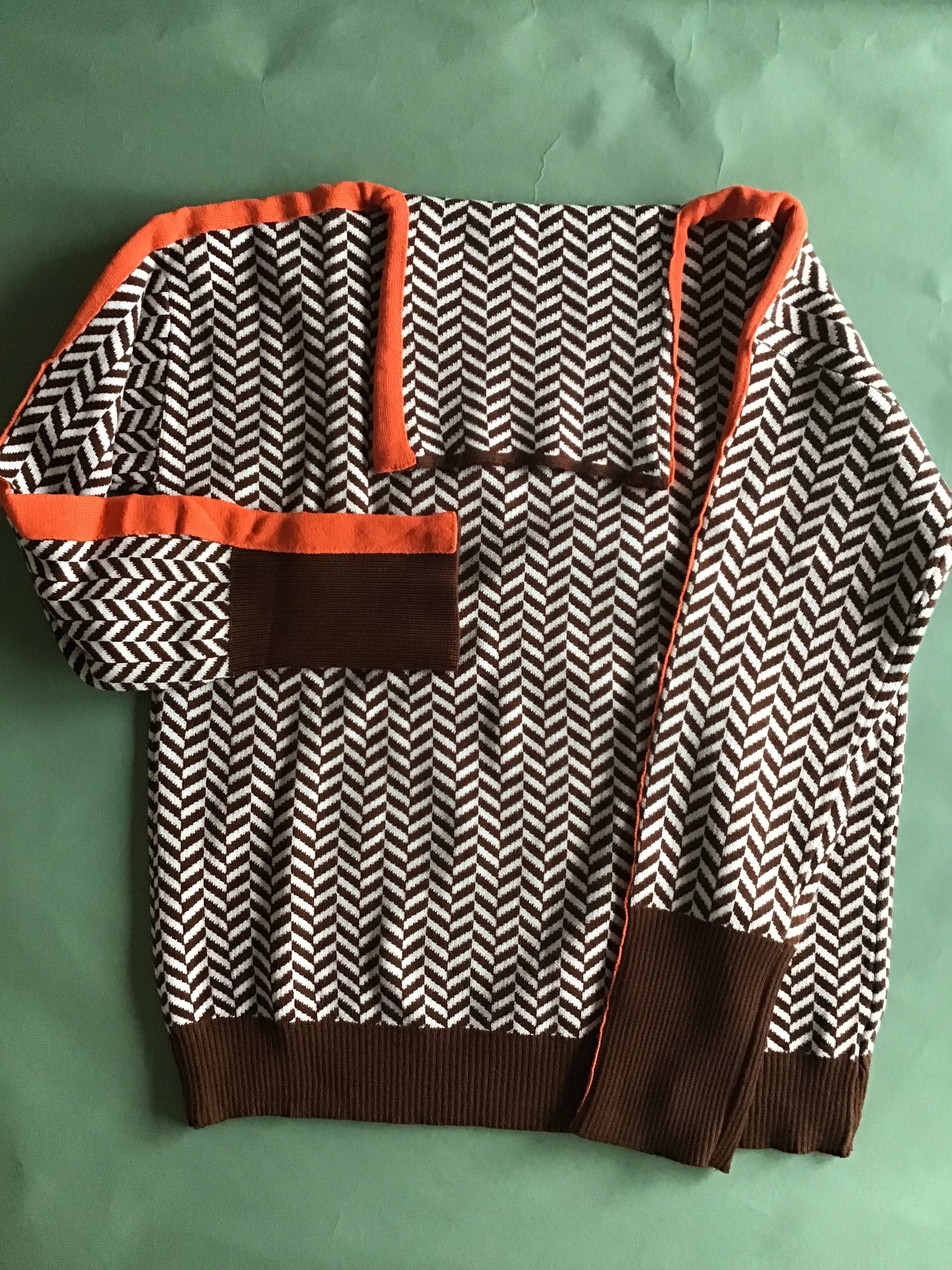 オレンジのラインがアクセントになった、幾何学模様のタートルニット☆