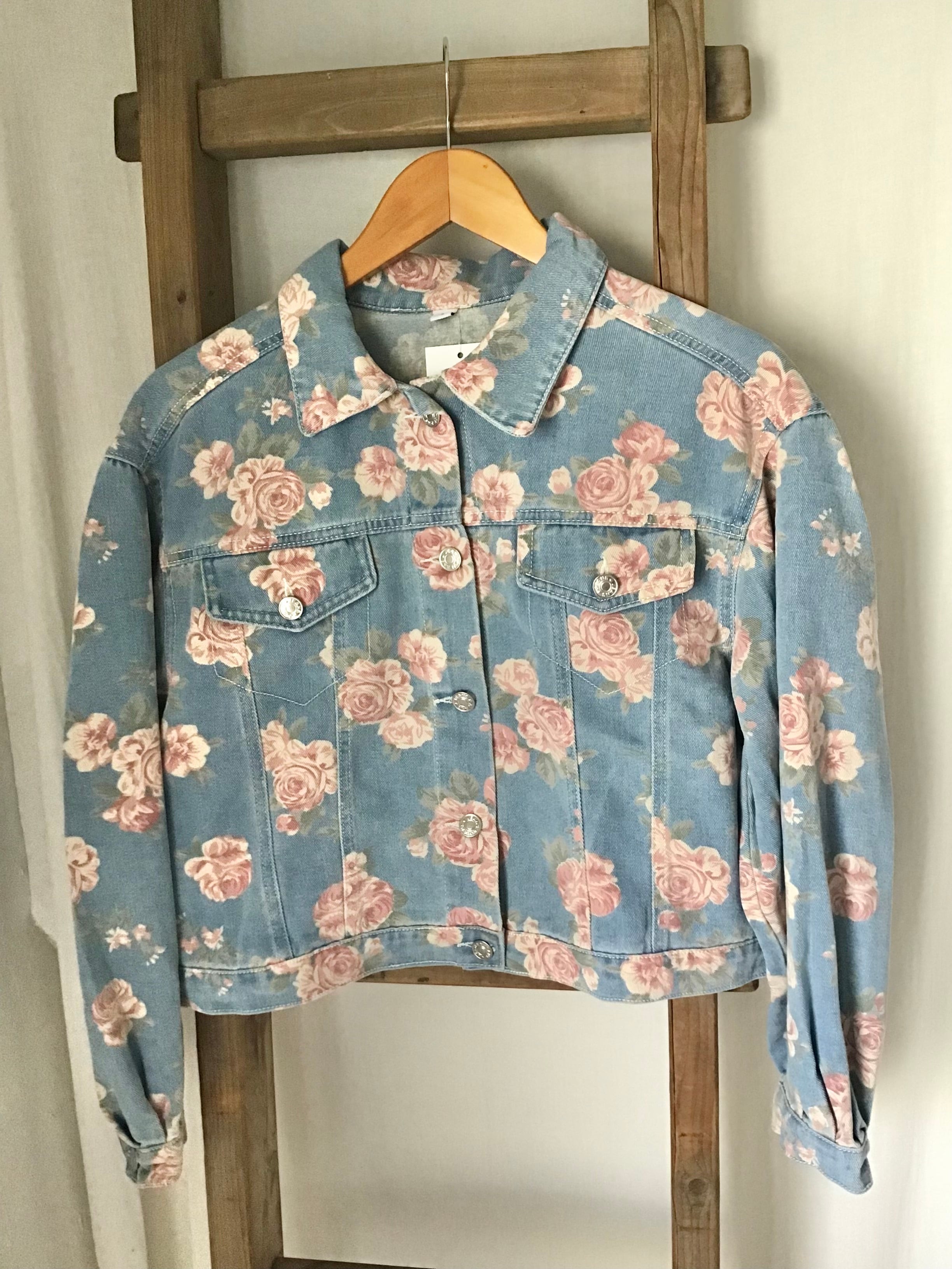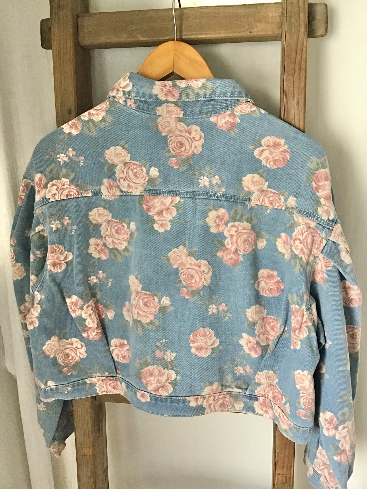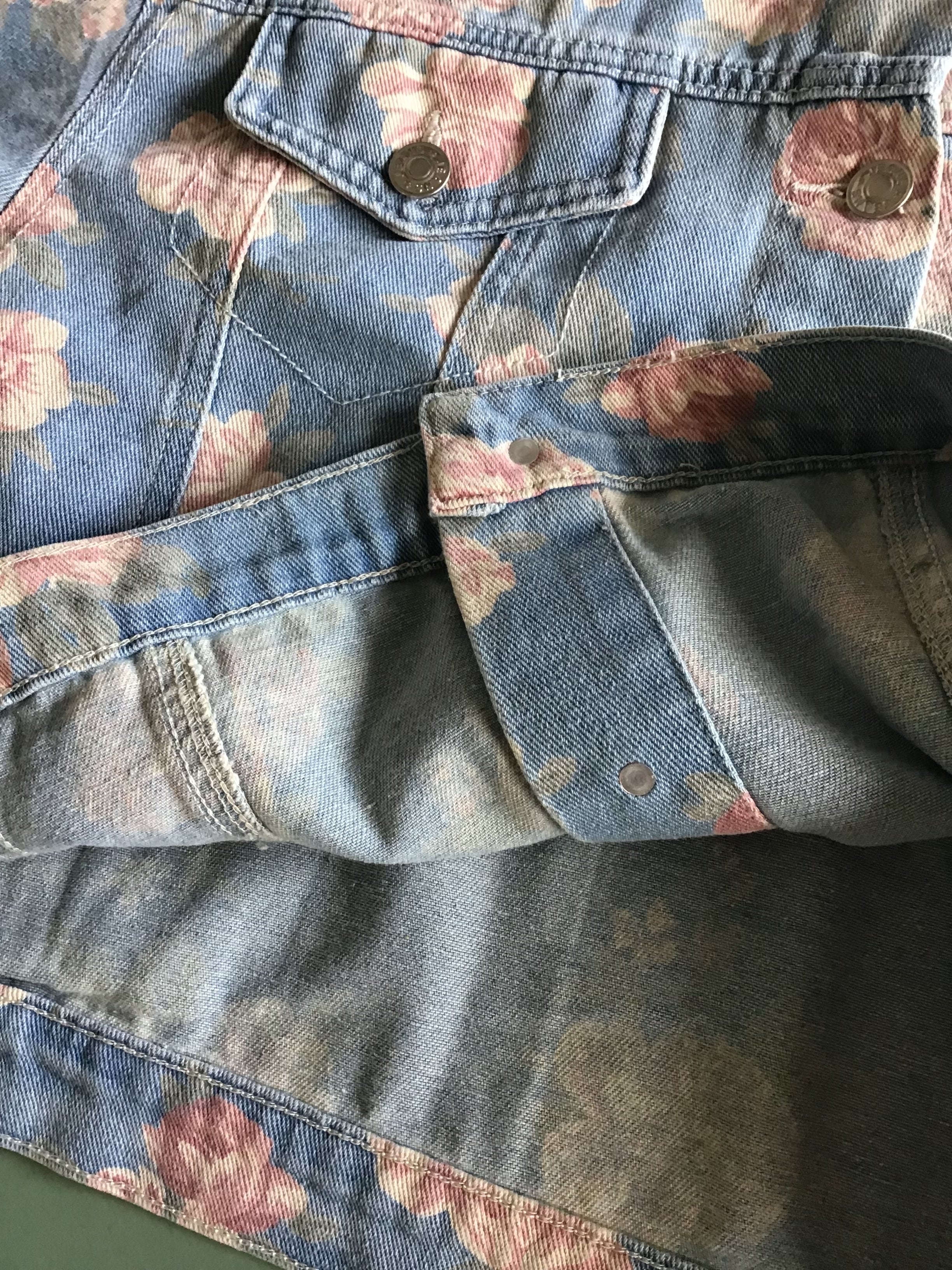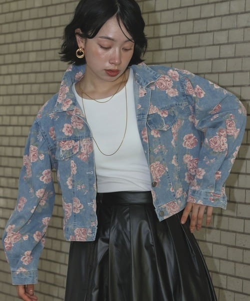 存在感のあるローズプリントをあしらったデニムジャケット。