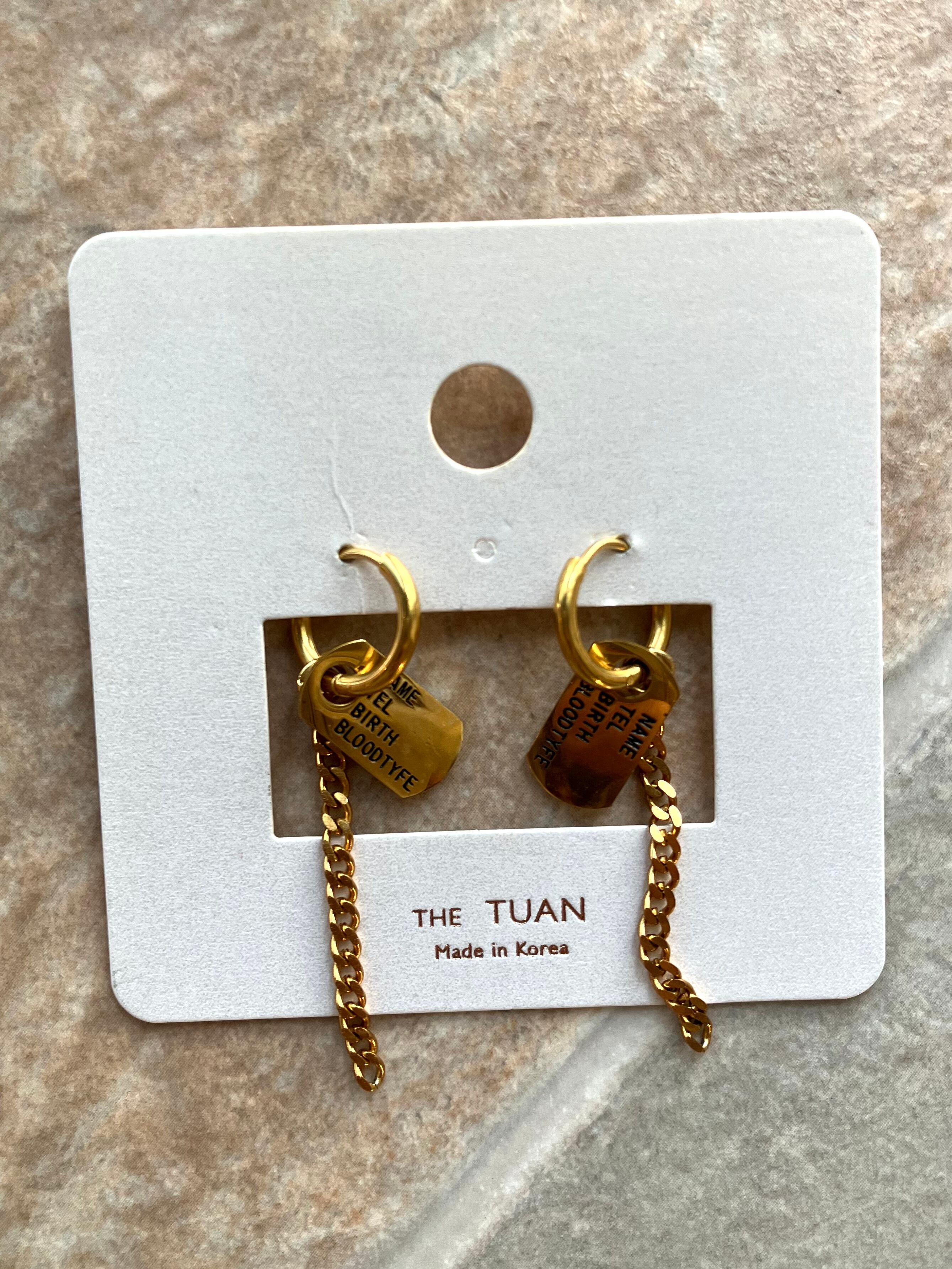 ゴールドのチェーンとちいさなドッグタグが揺れるフープピアスです。