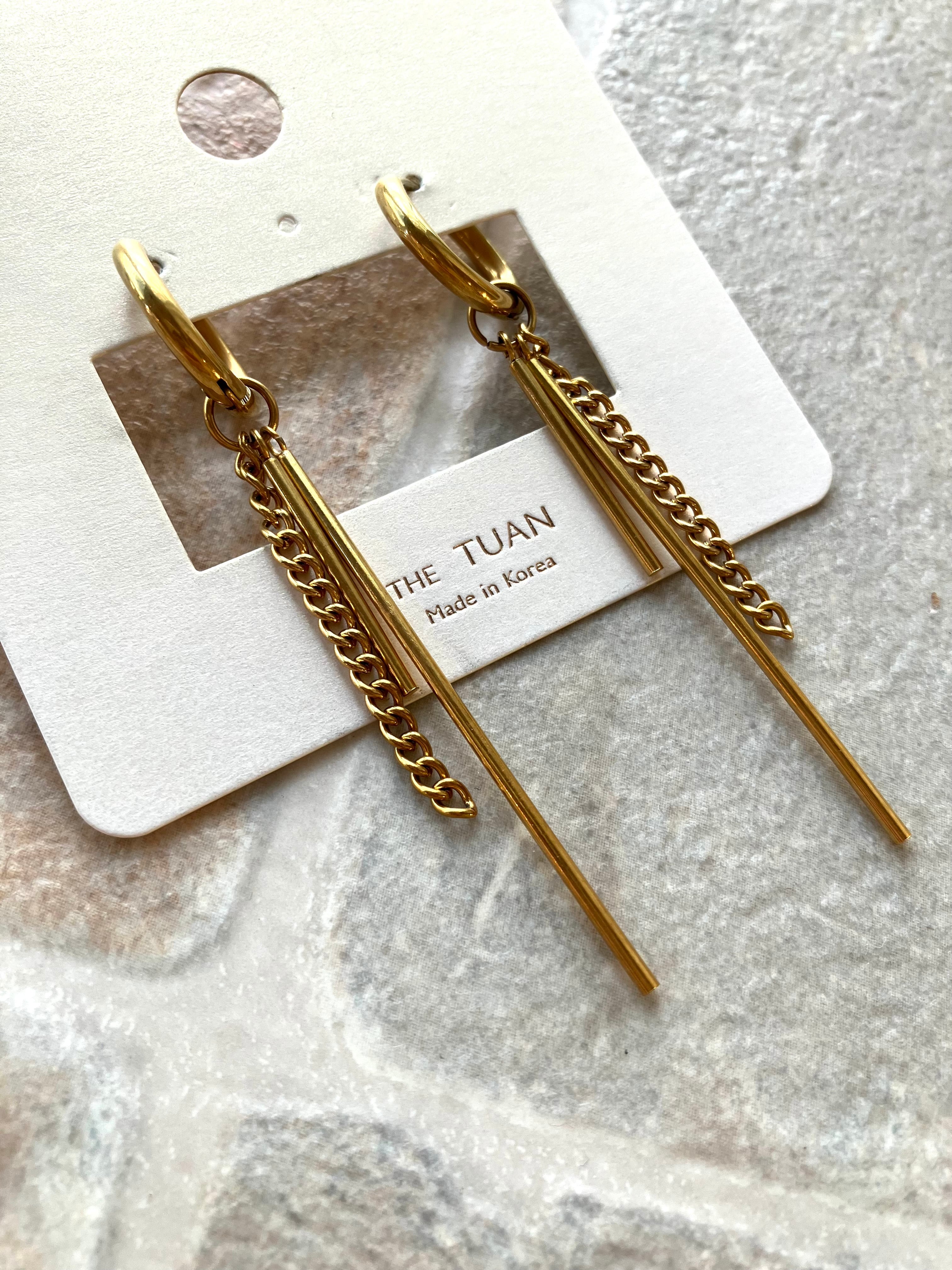 ゴールドのチェーンたちが揺れるフープピアスです。
