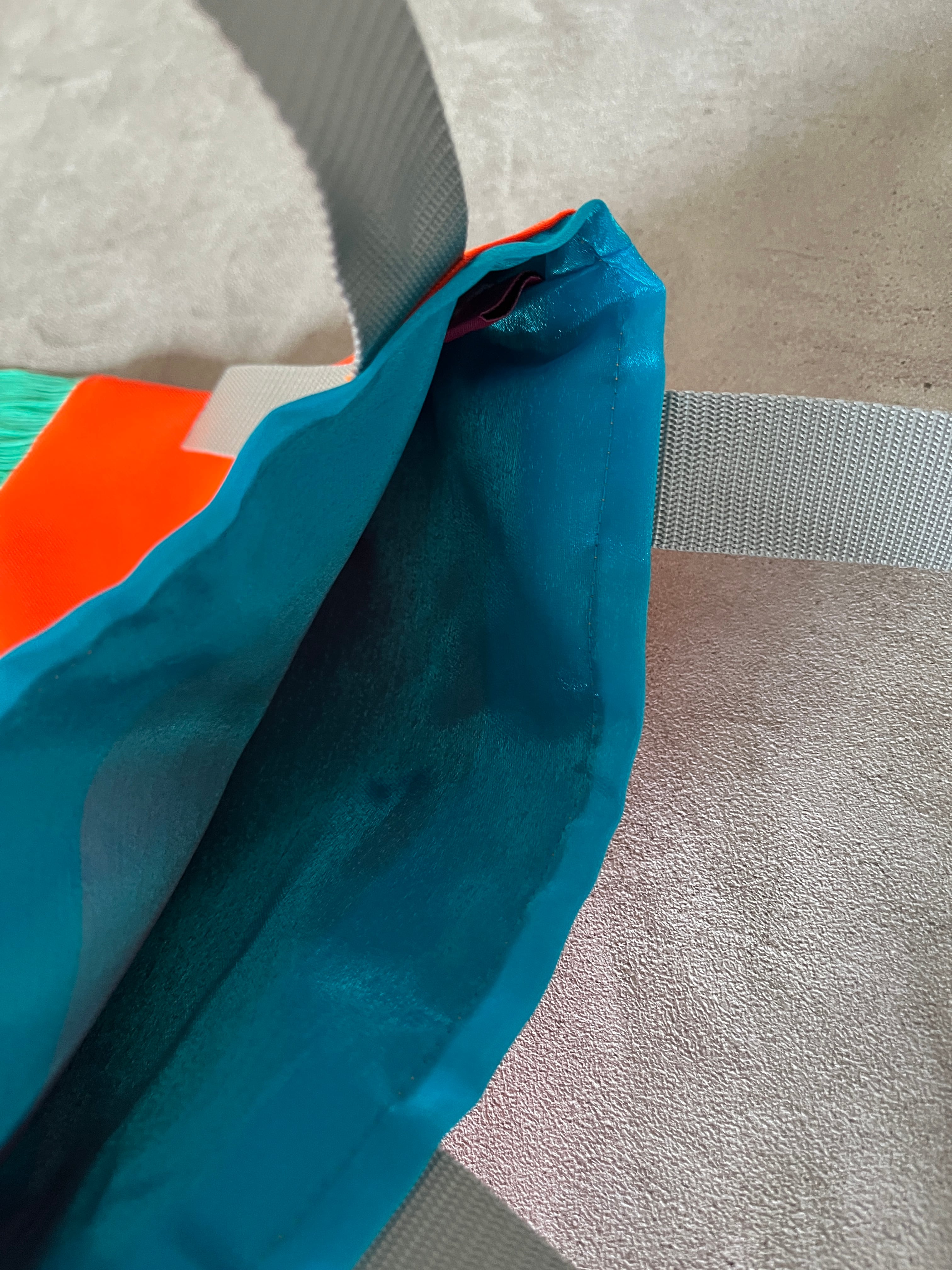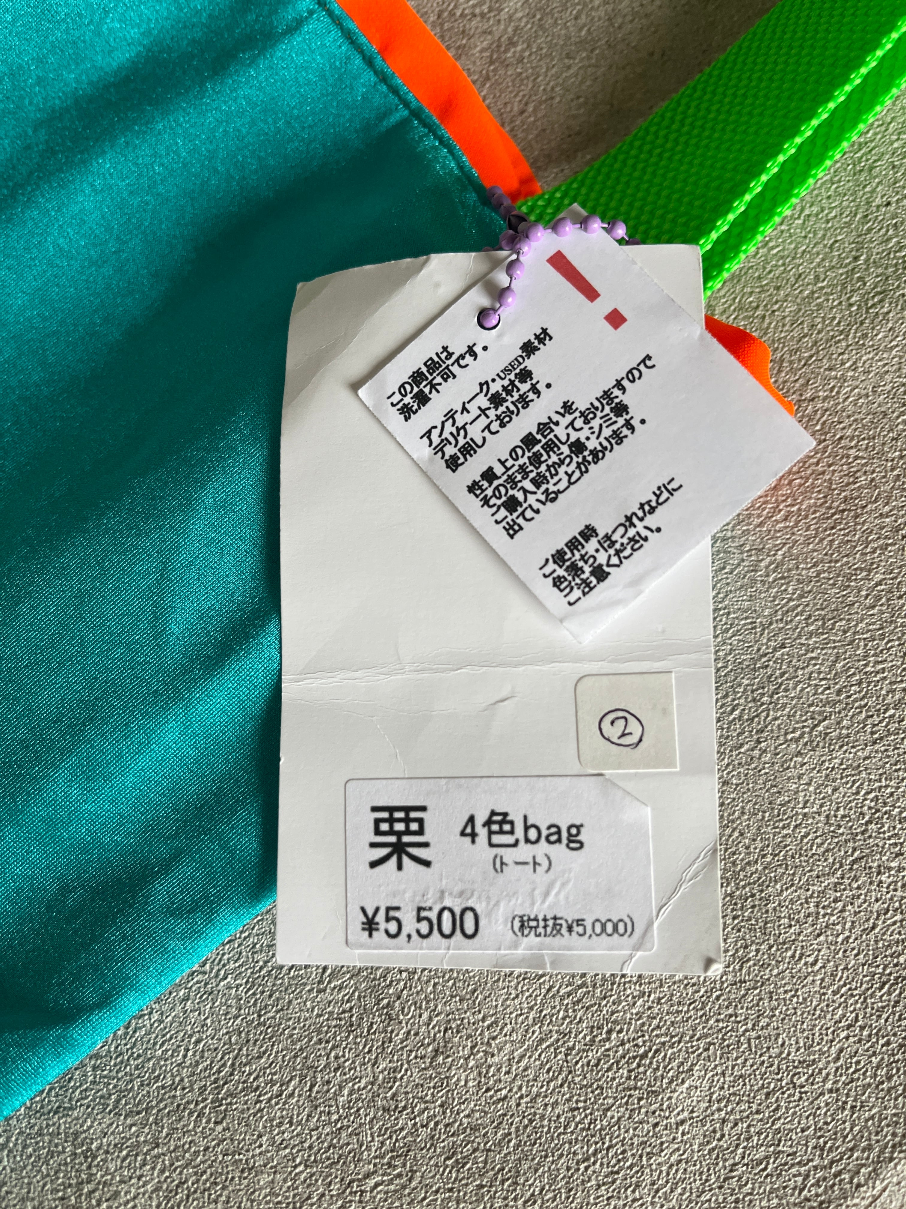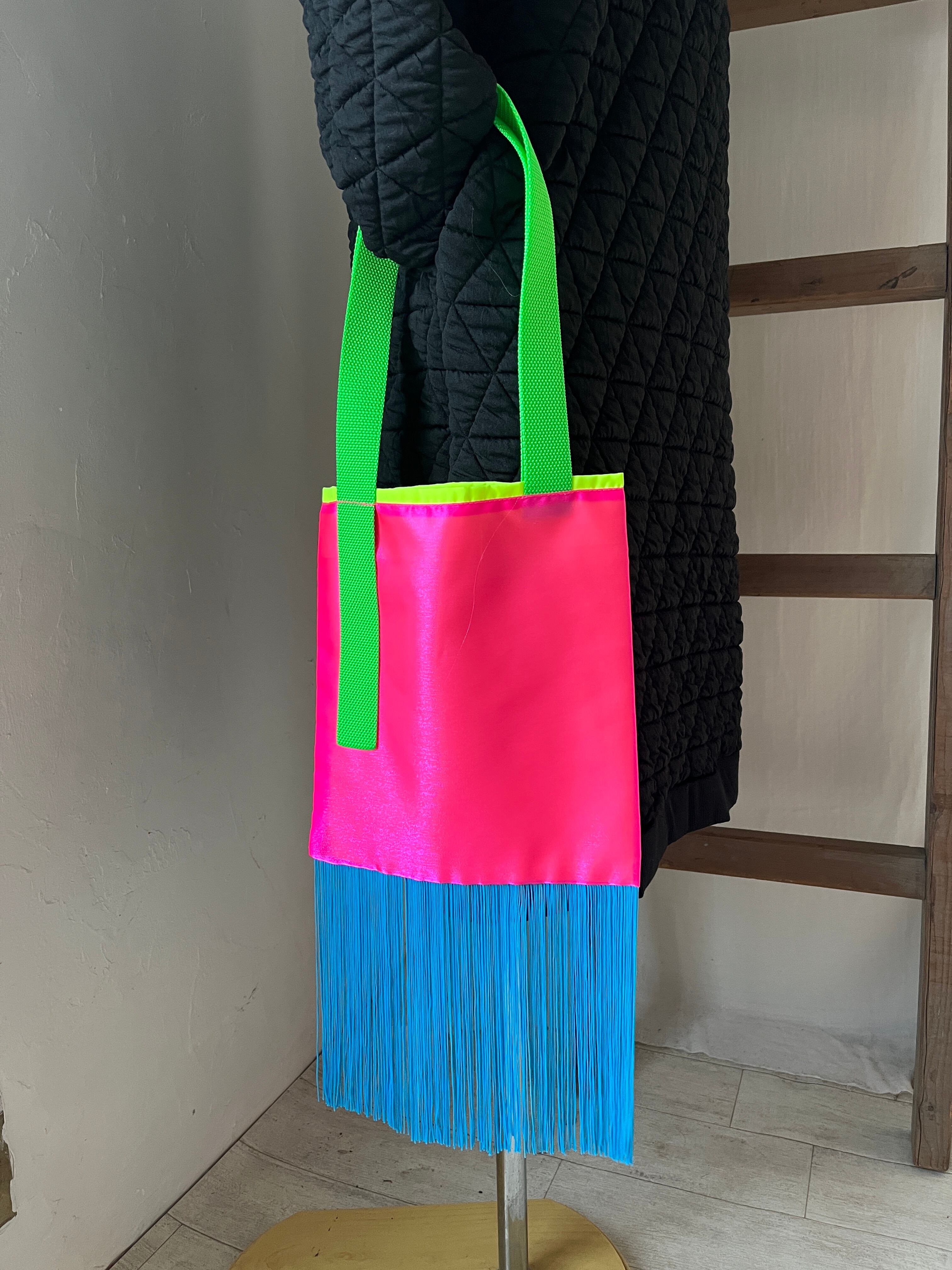 本体、パイピング&裏地、フリンジ、ハンドル、4色のカラフルなフラットなトートバッグ。