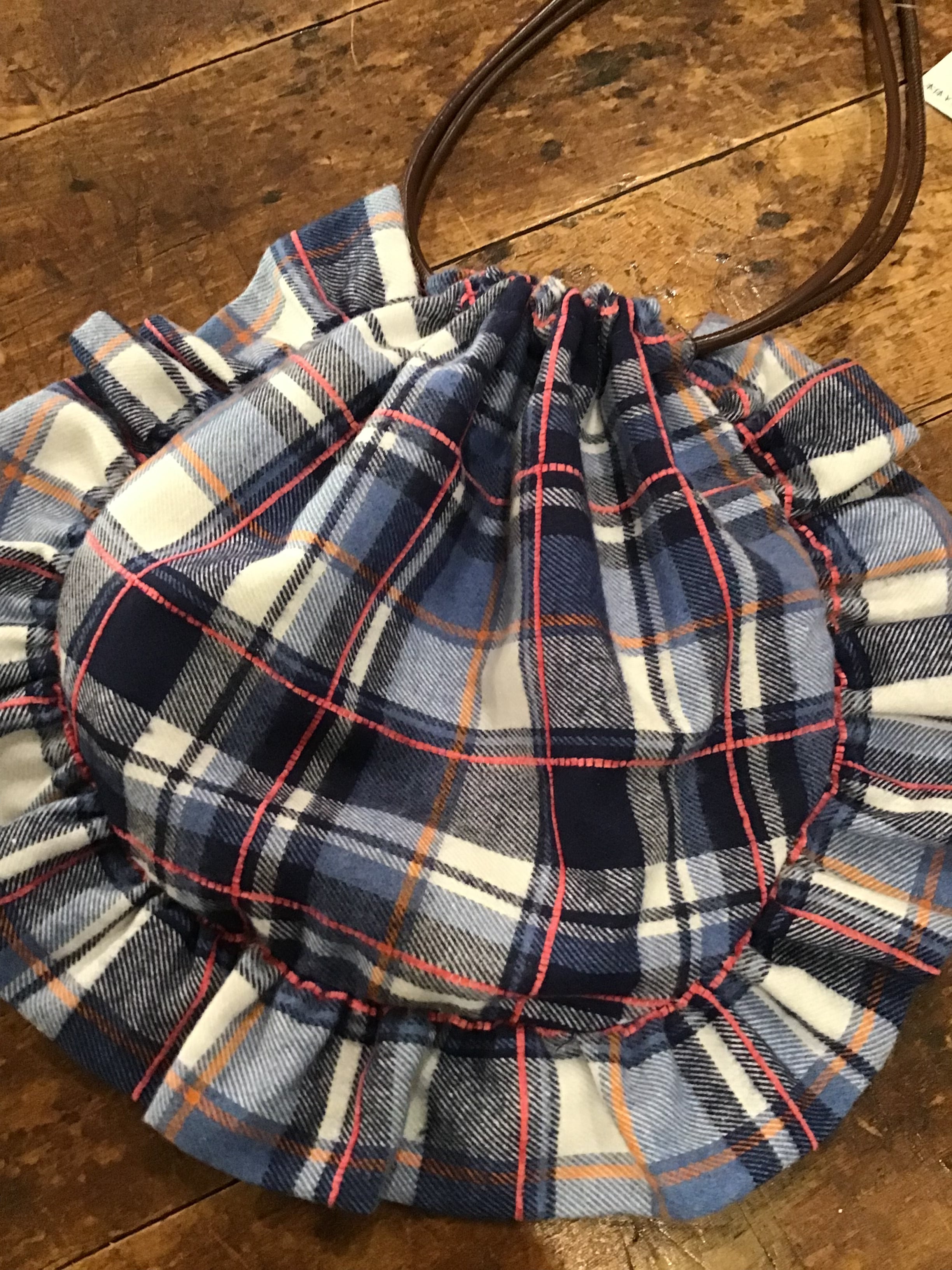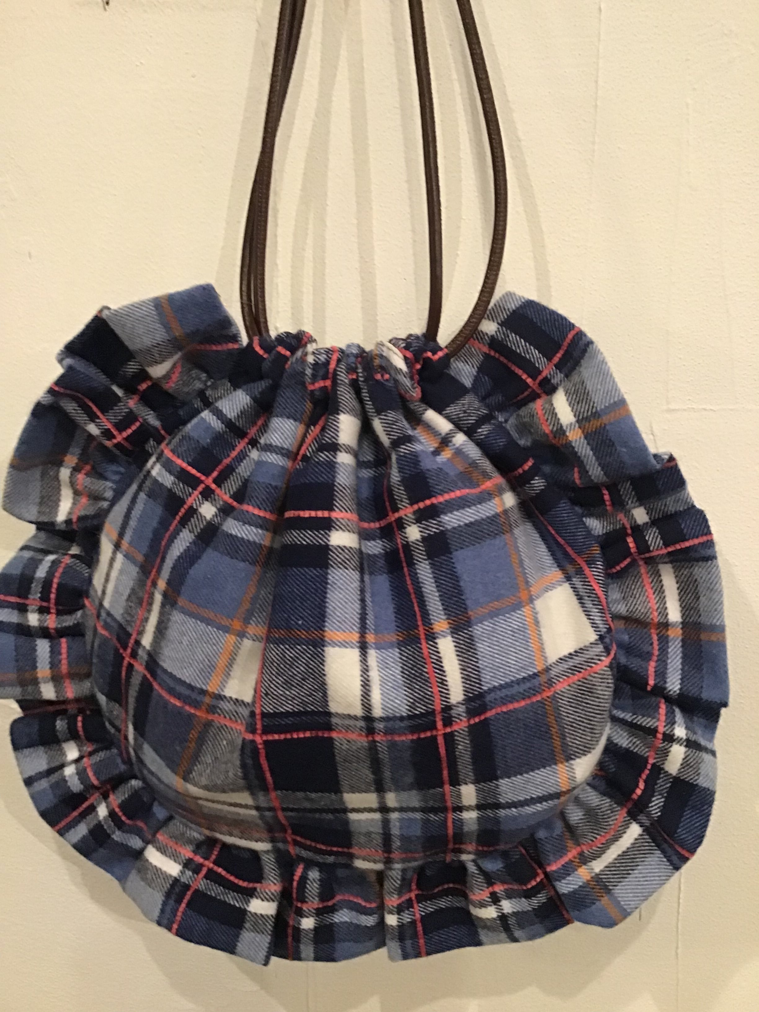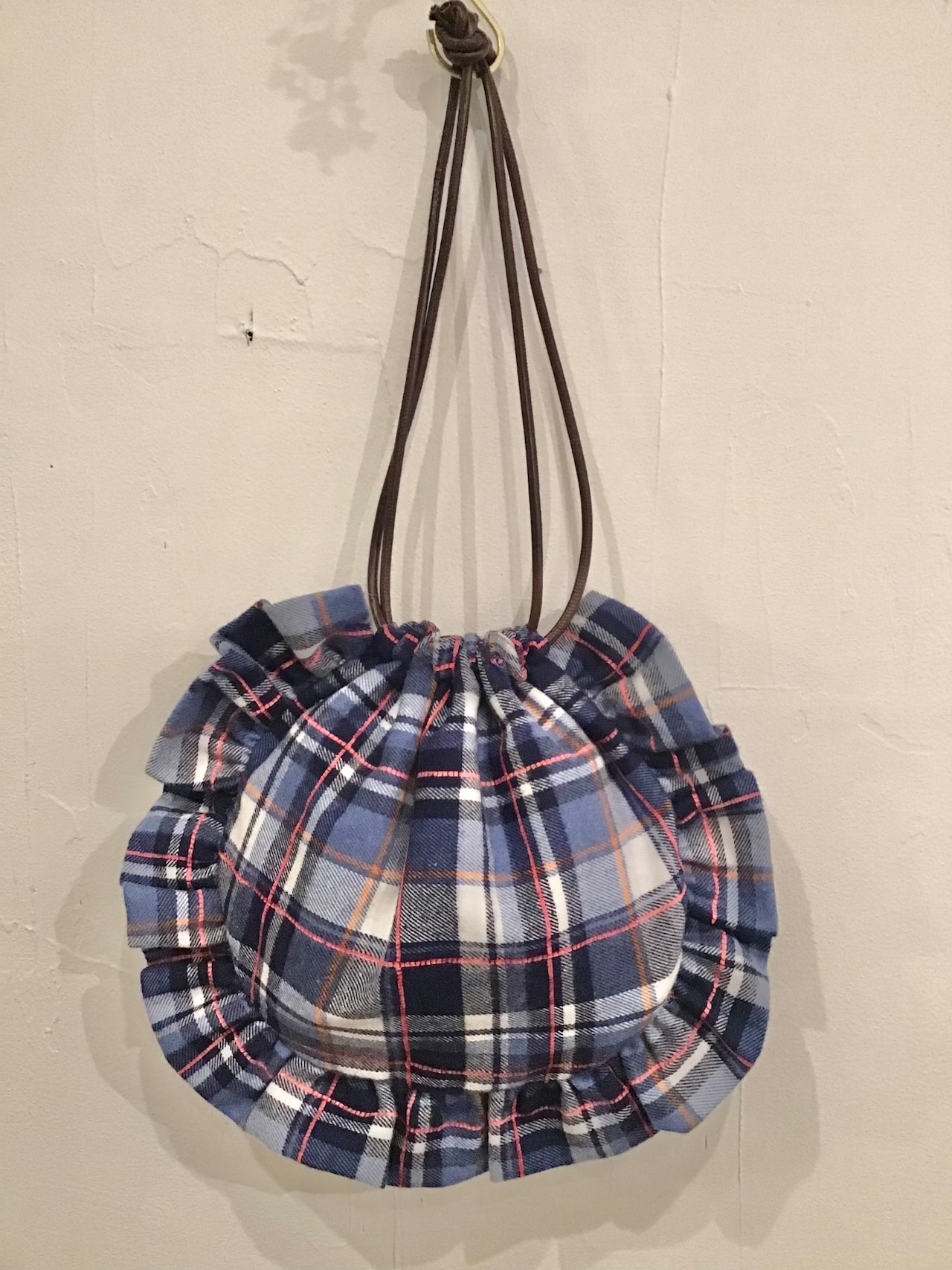 カジュアルなチェック柄と、さりげないフリルがポイントの巾着バッグ。