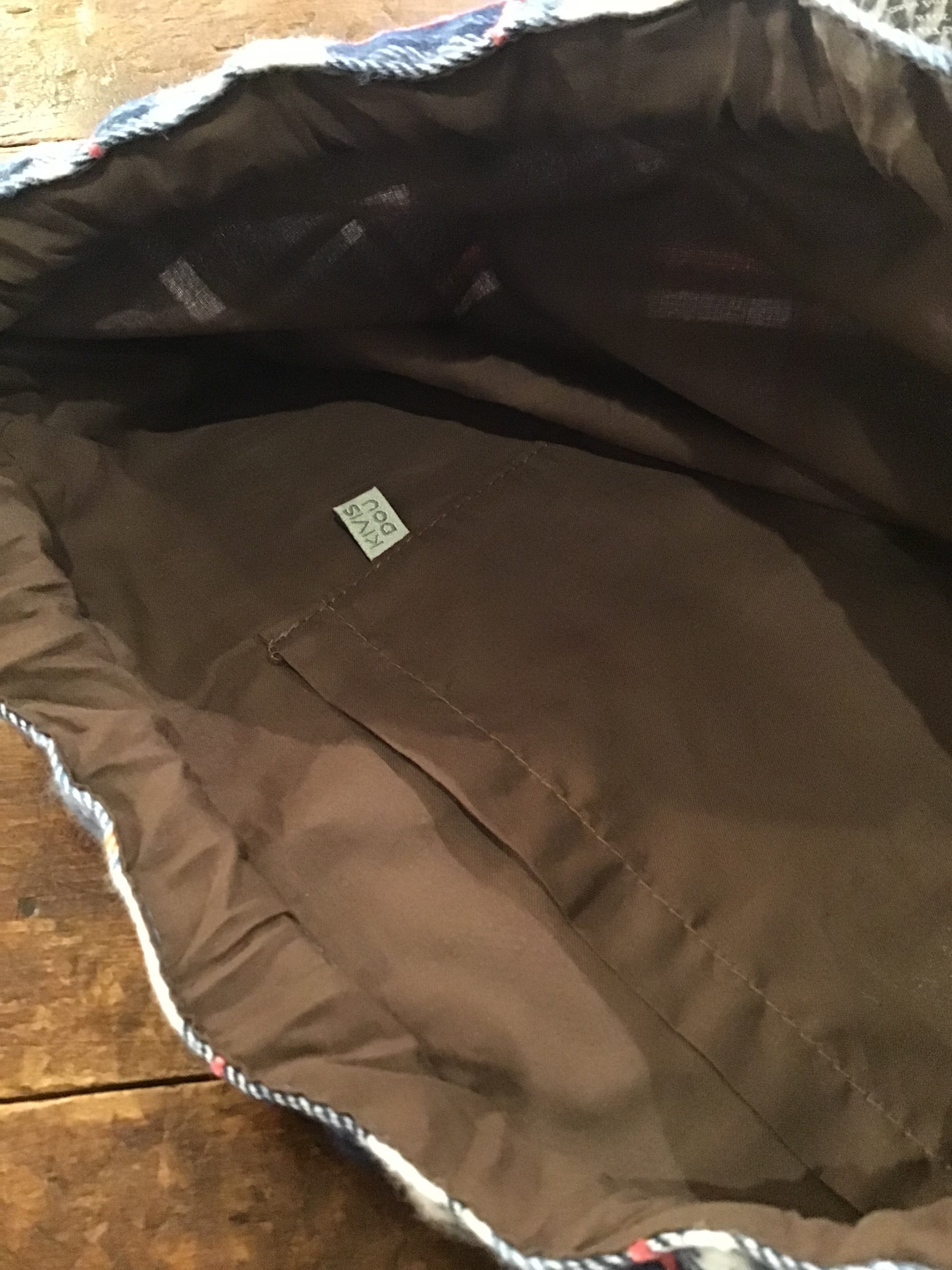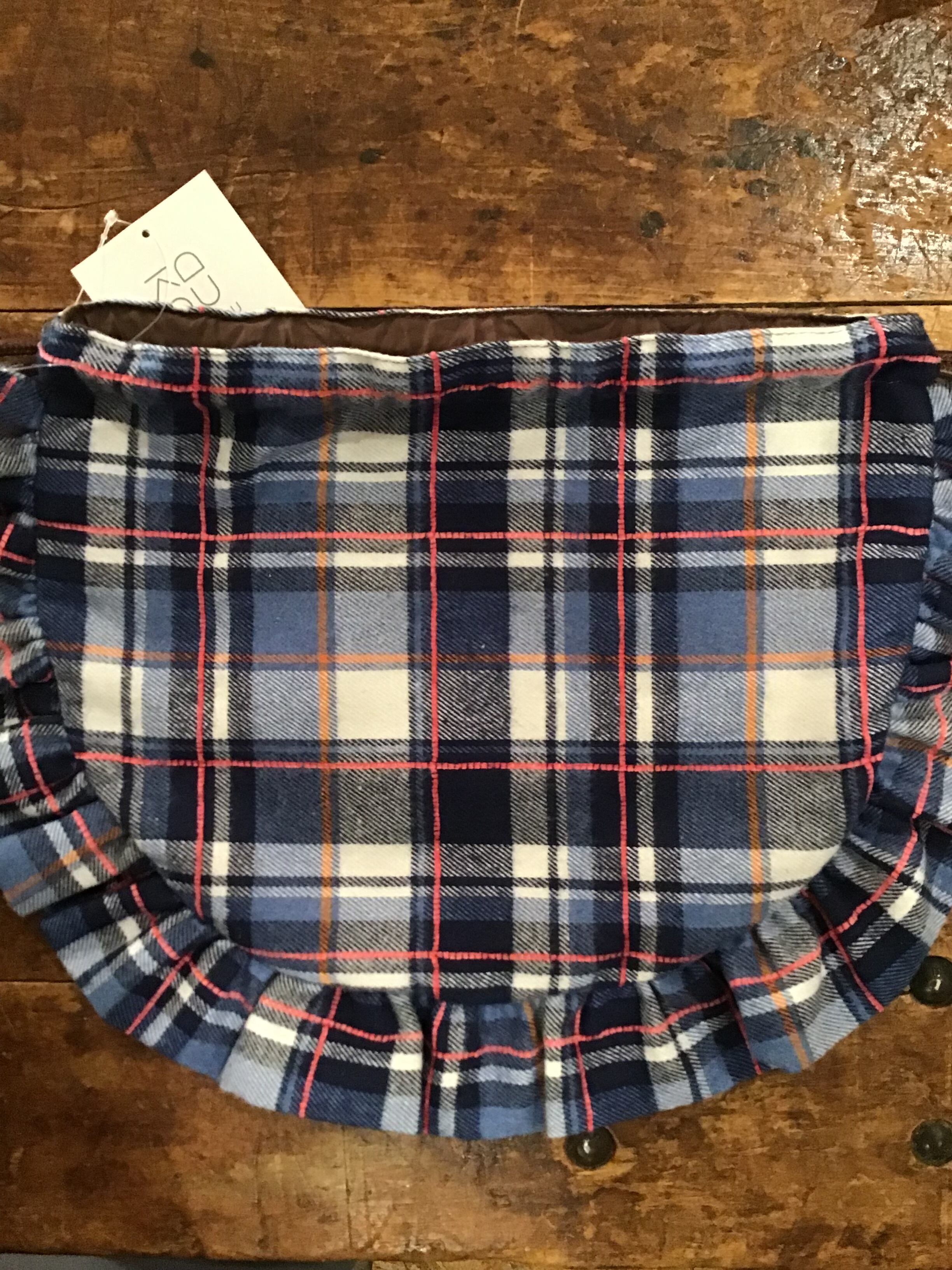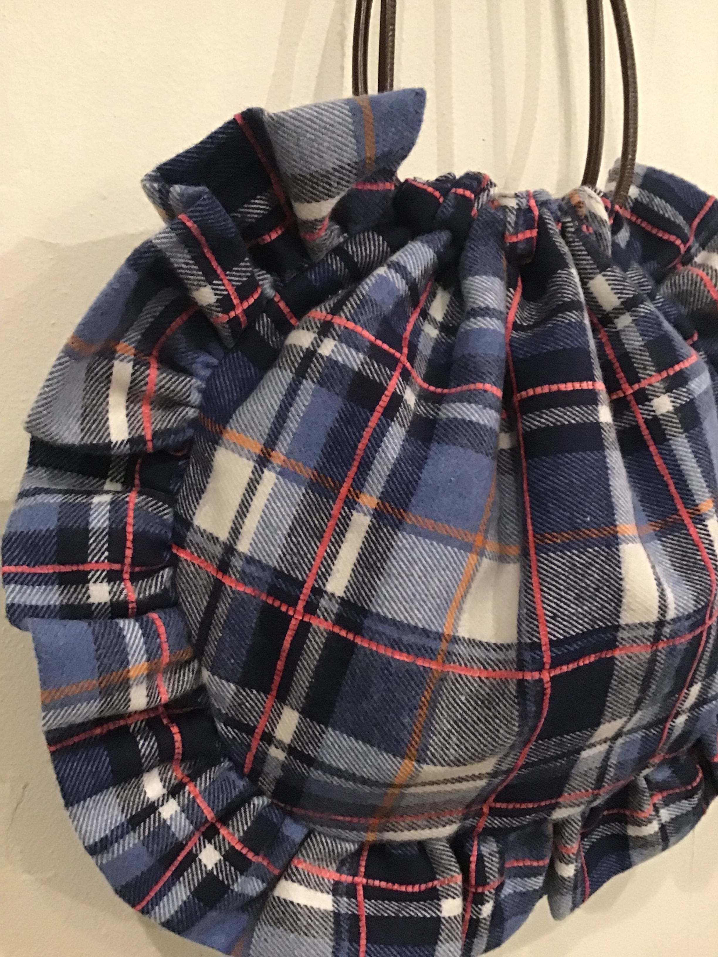 カジュアルなチェック柄と、さりげないフリルがポイントの巾着バッグ。