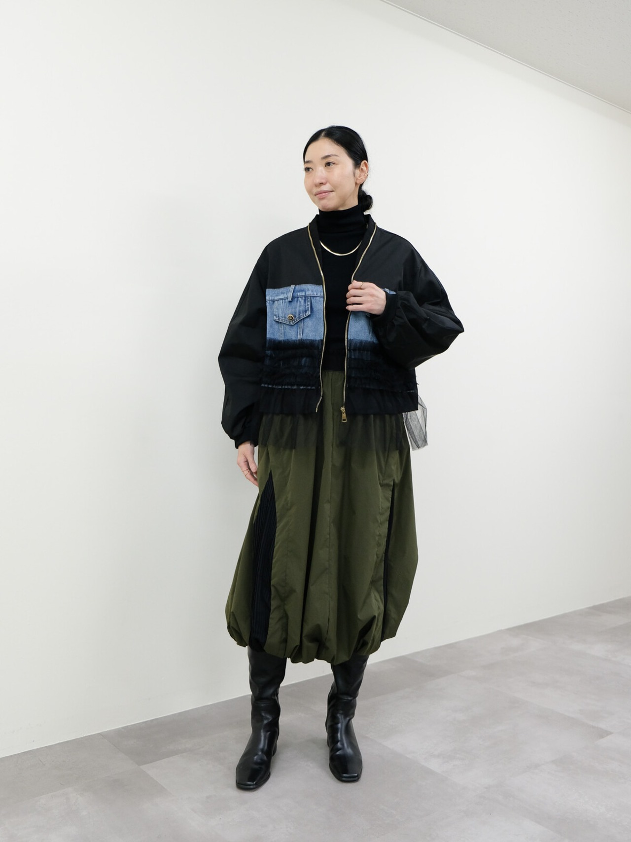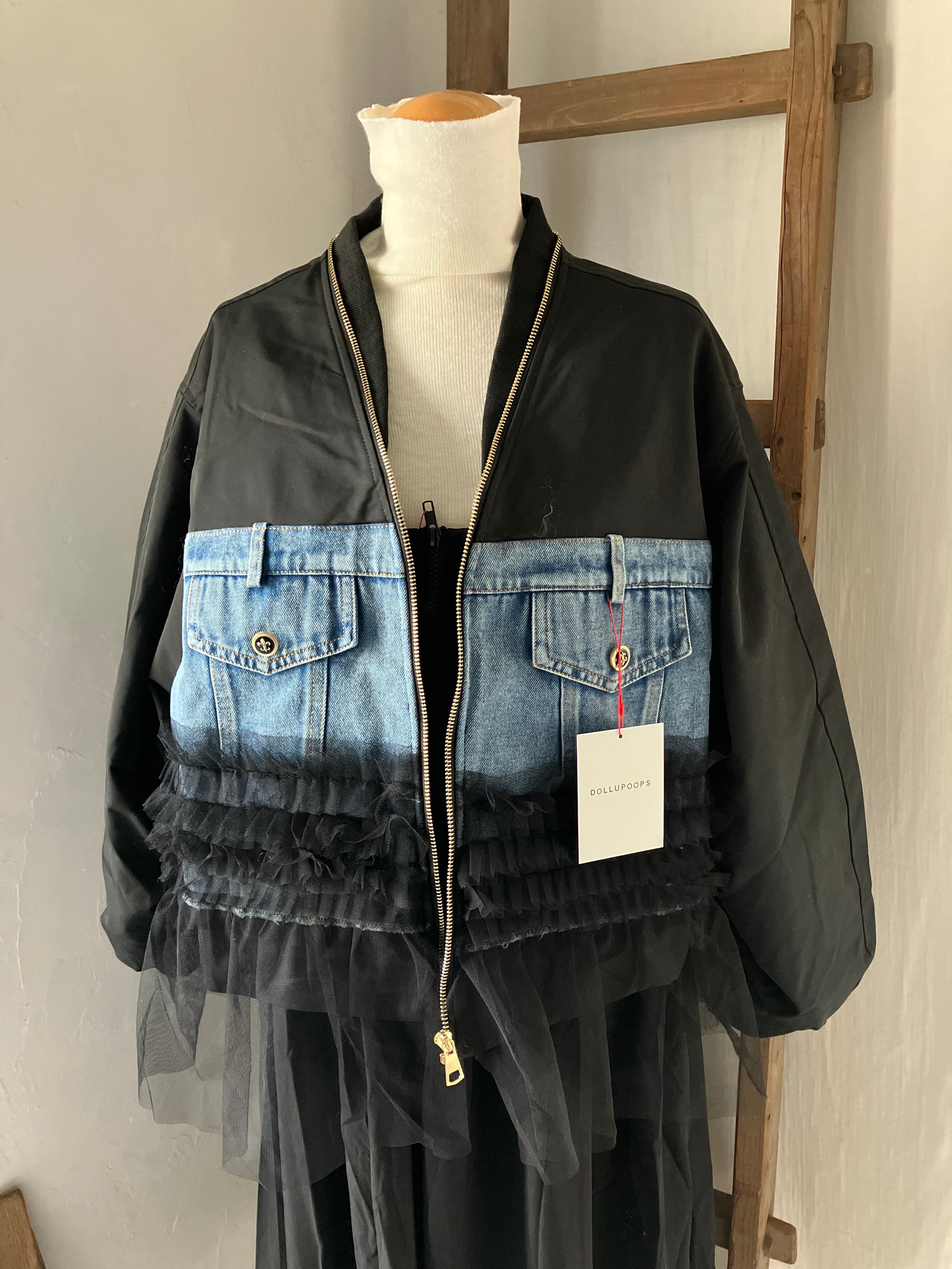 MA-1ツイルにデニムと柔らかいチュール素材を使用したぶるぞん。