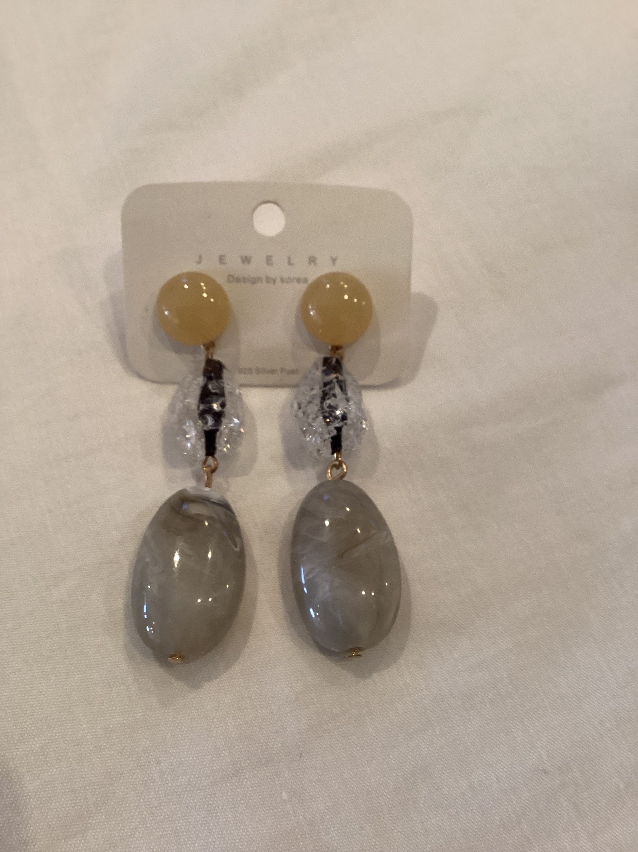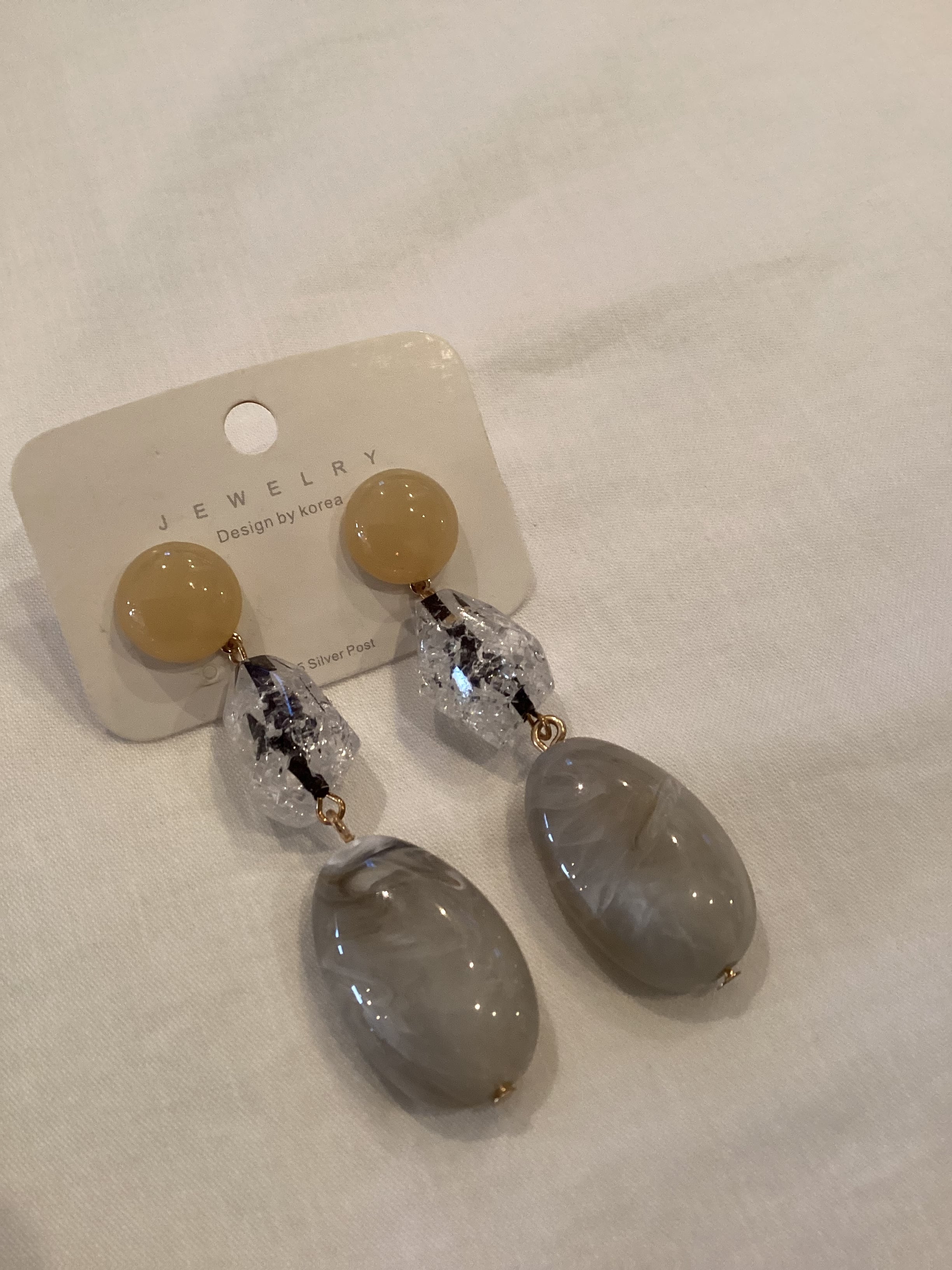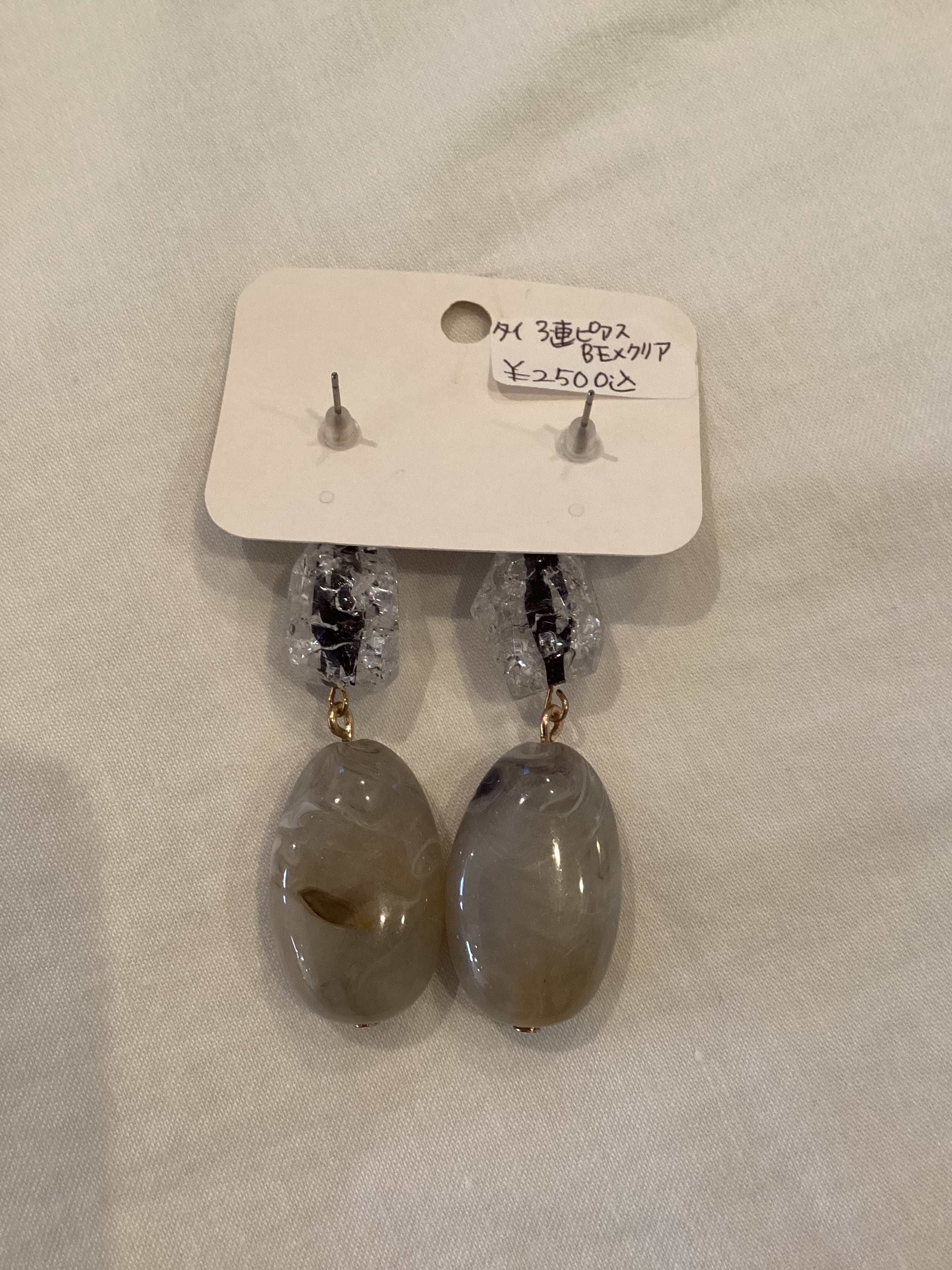 ベージュ、クリア、グレーのバランスが可愛い3連のピアス。