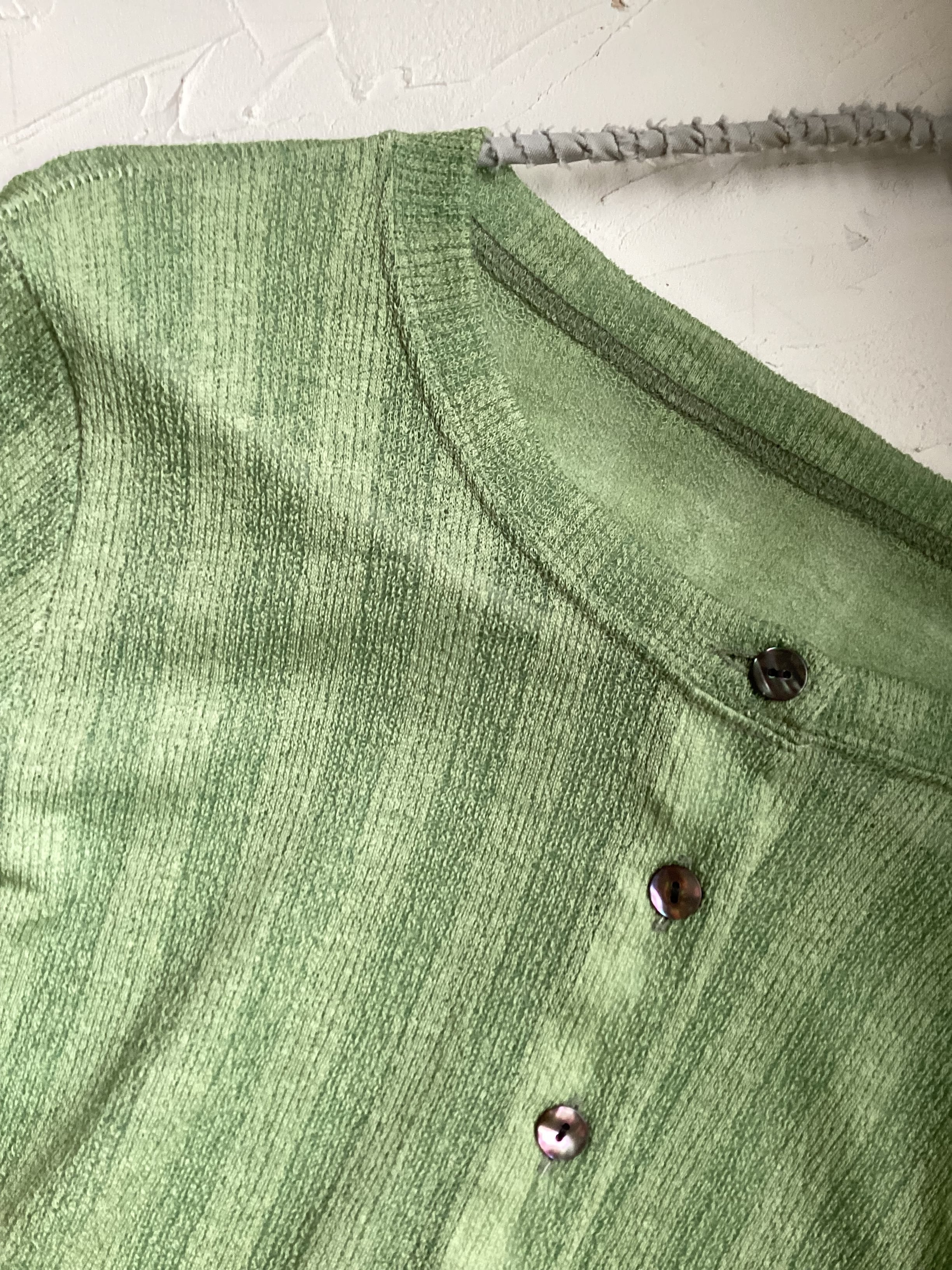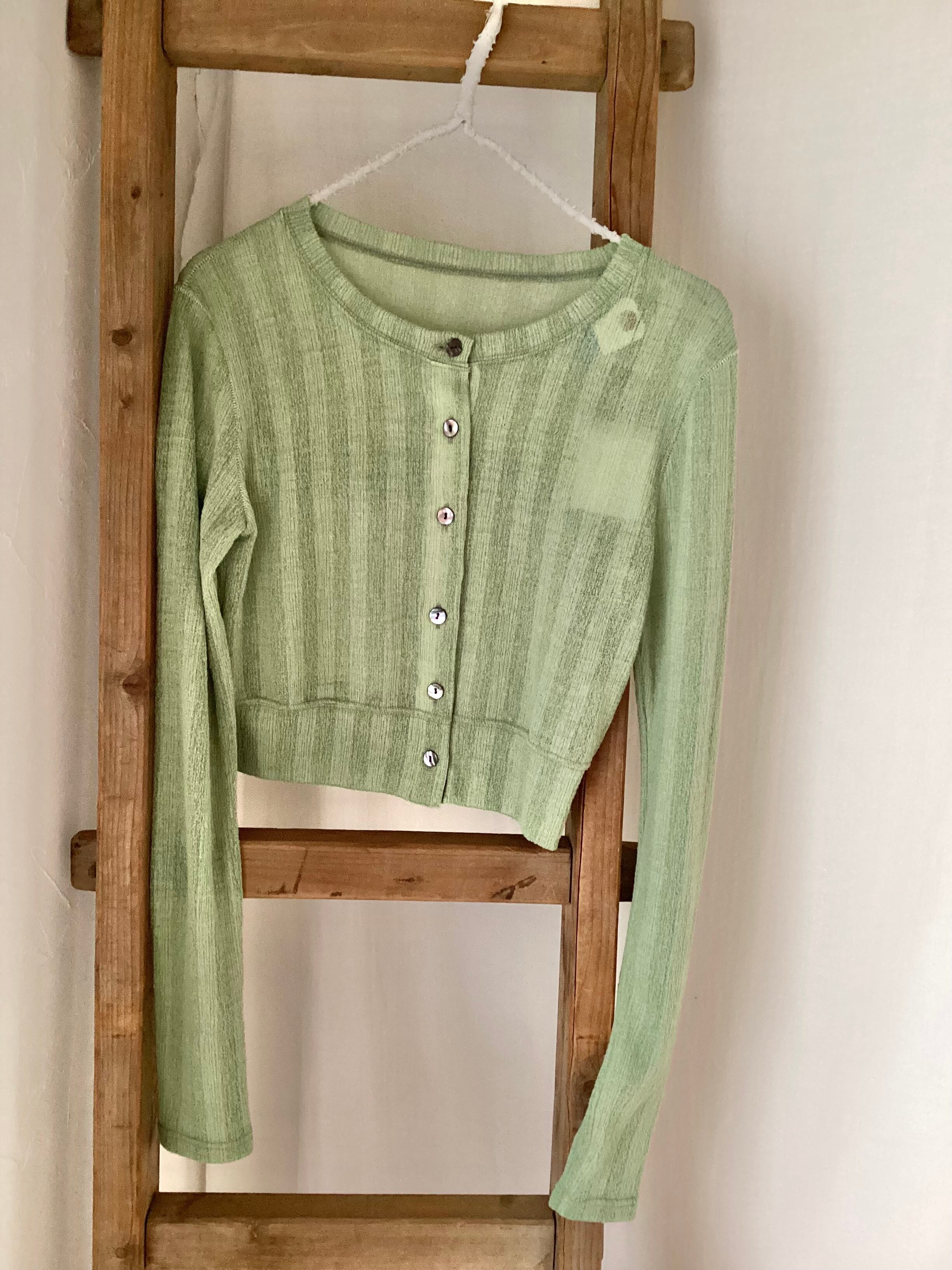 ソフトなグリーンカラーが爽やかな雰囲気のカーディガン。