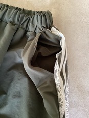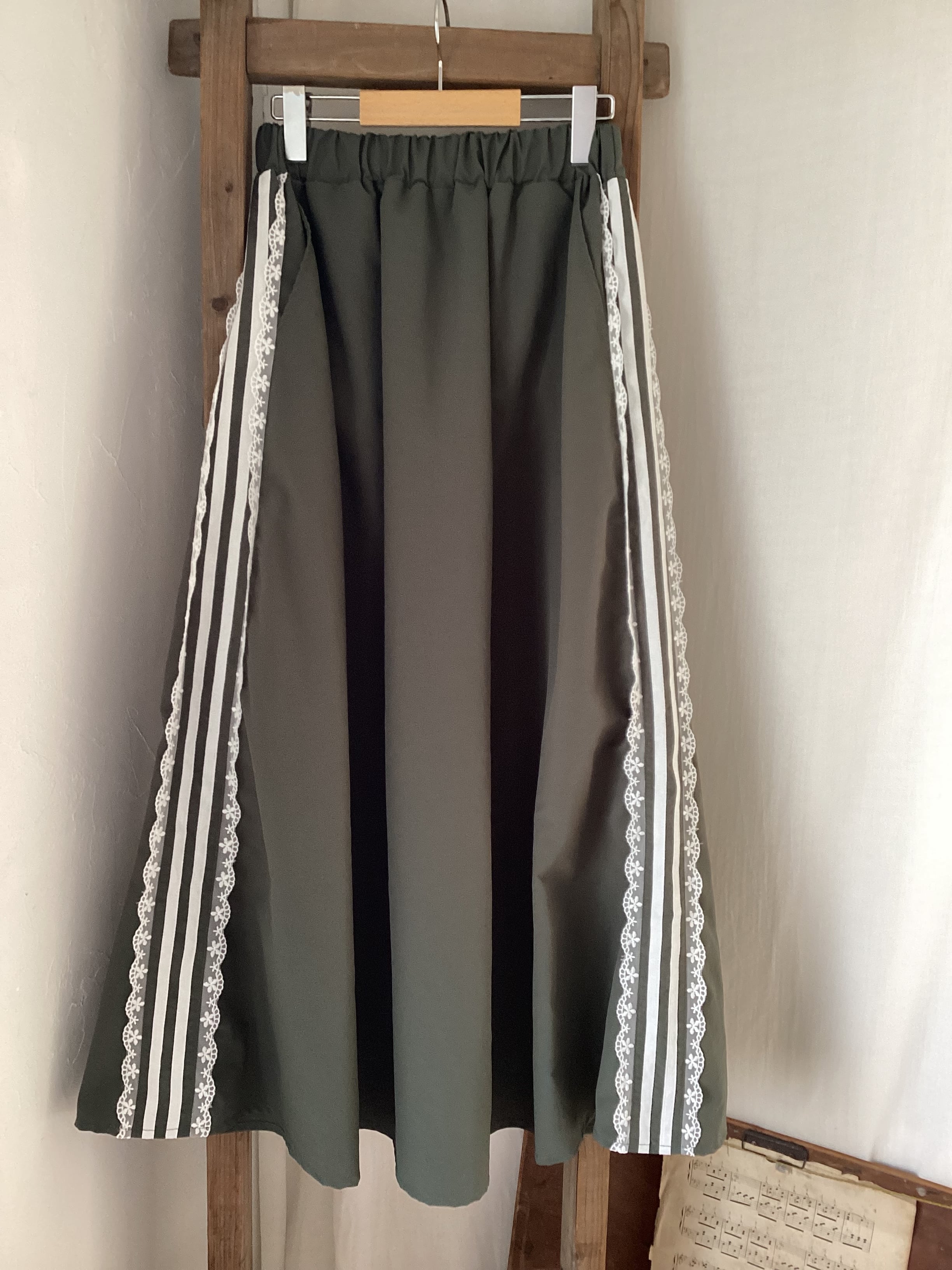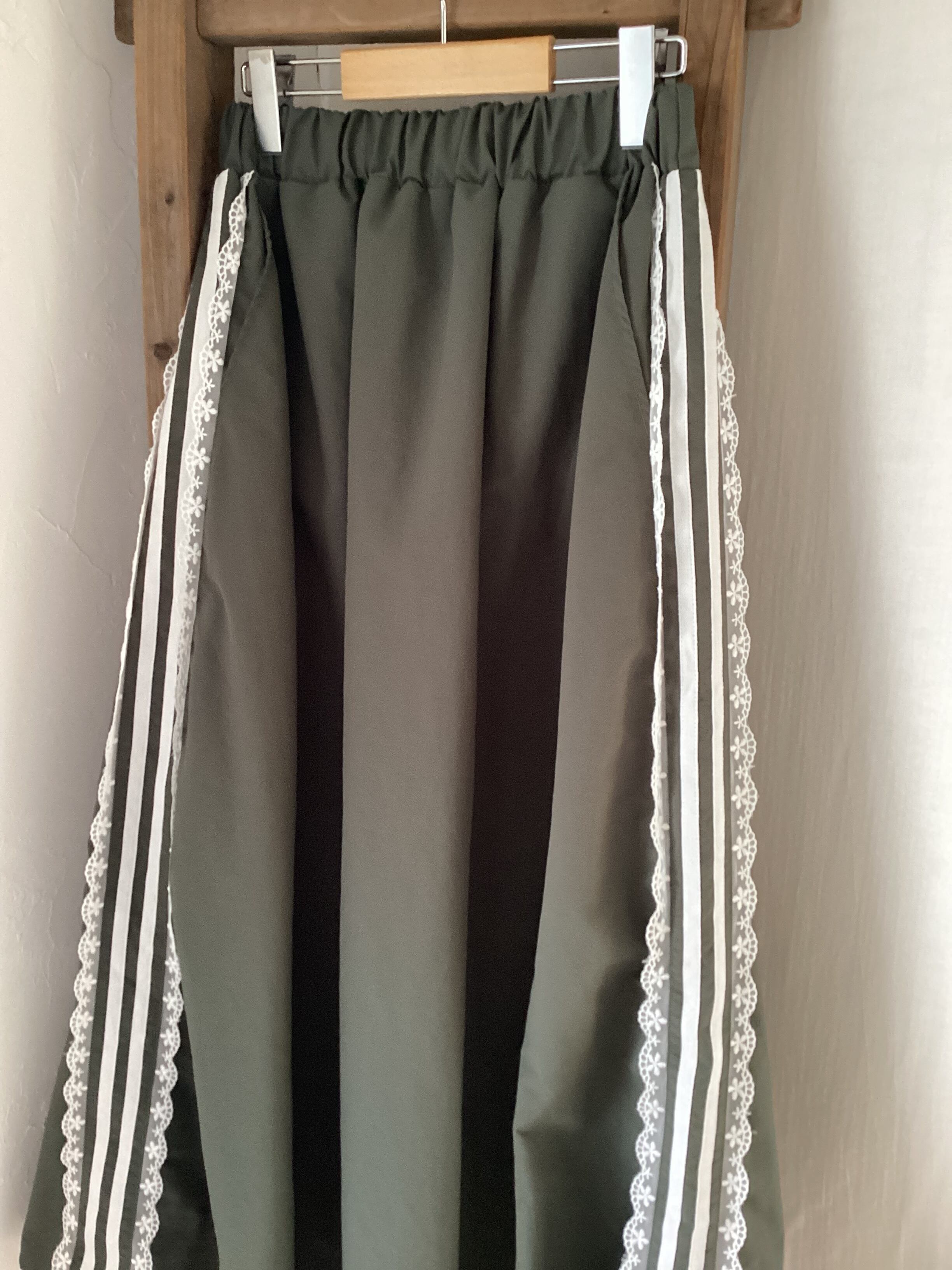 サイドに沿ってあしらわれたラインテープは、太さの違うストライプが縦のラインを強調し、スカート全体をすっきりと見せてくれる視覚効果も。
