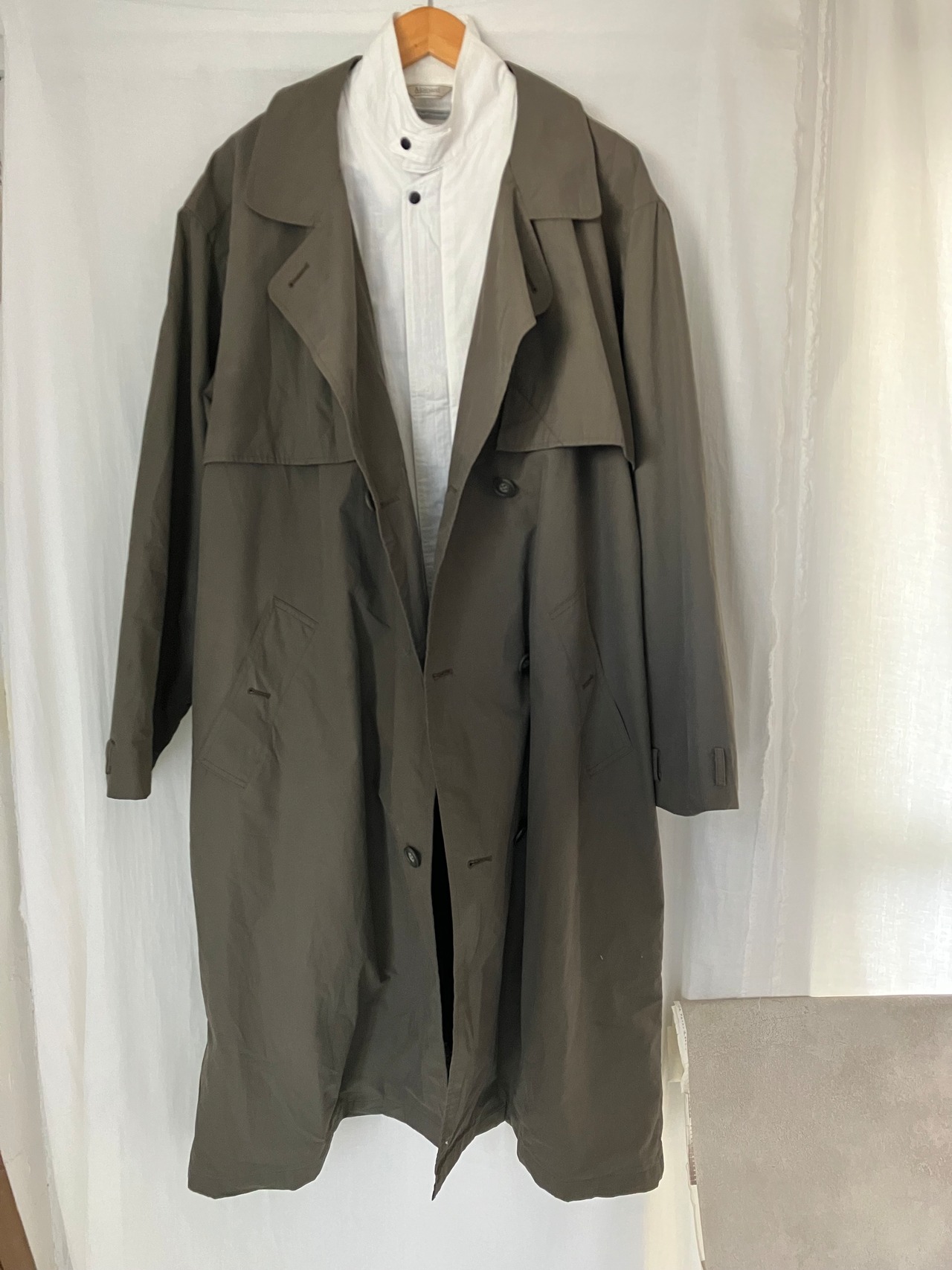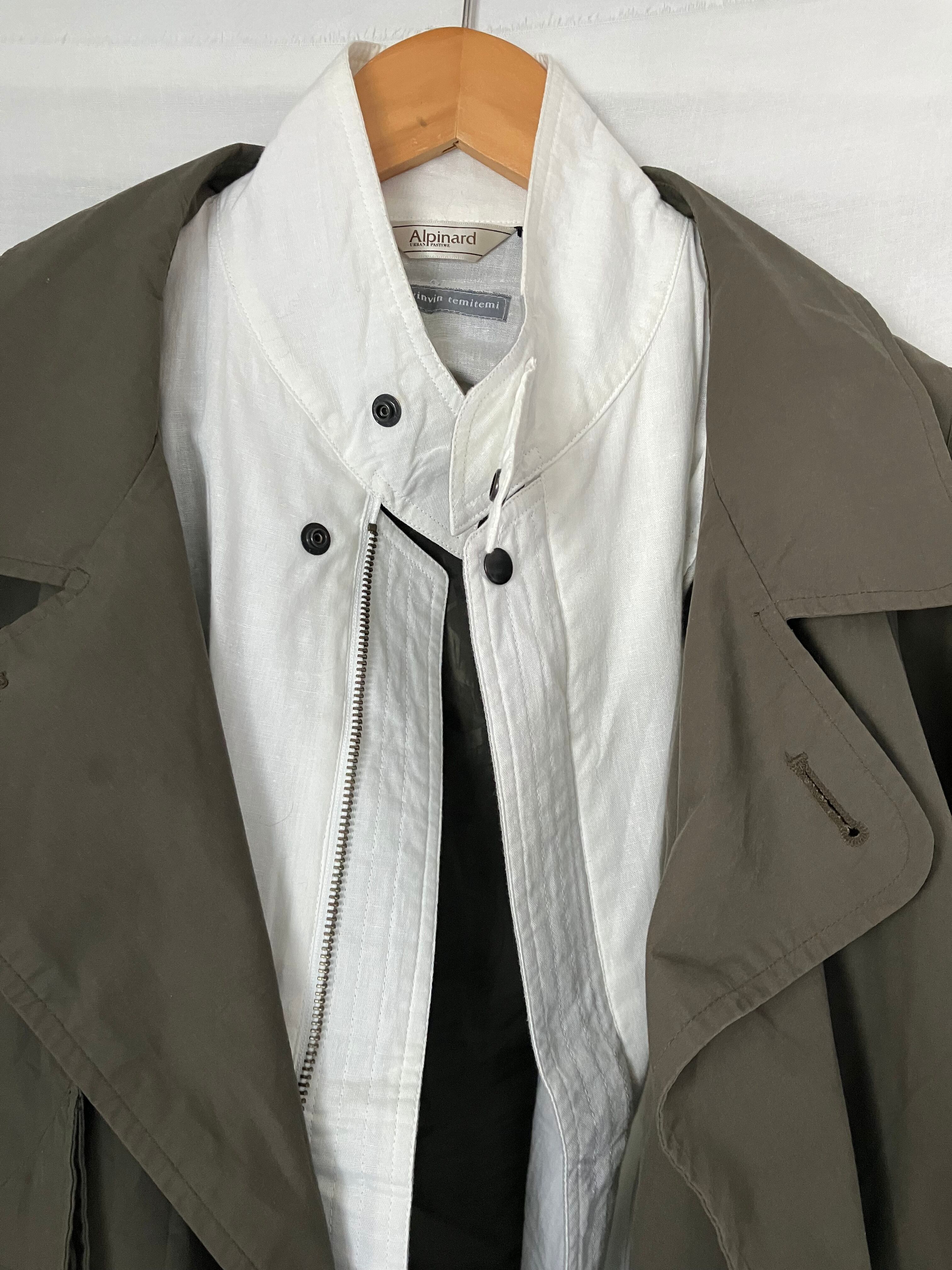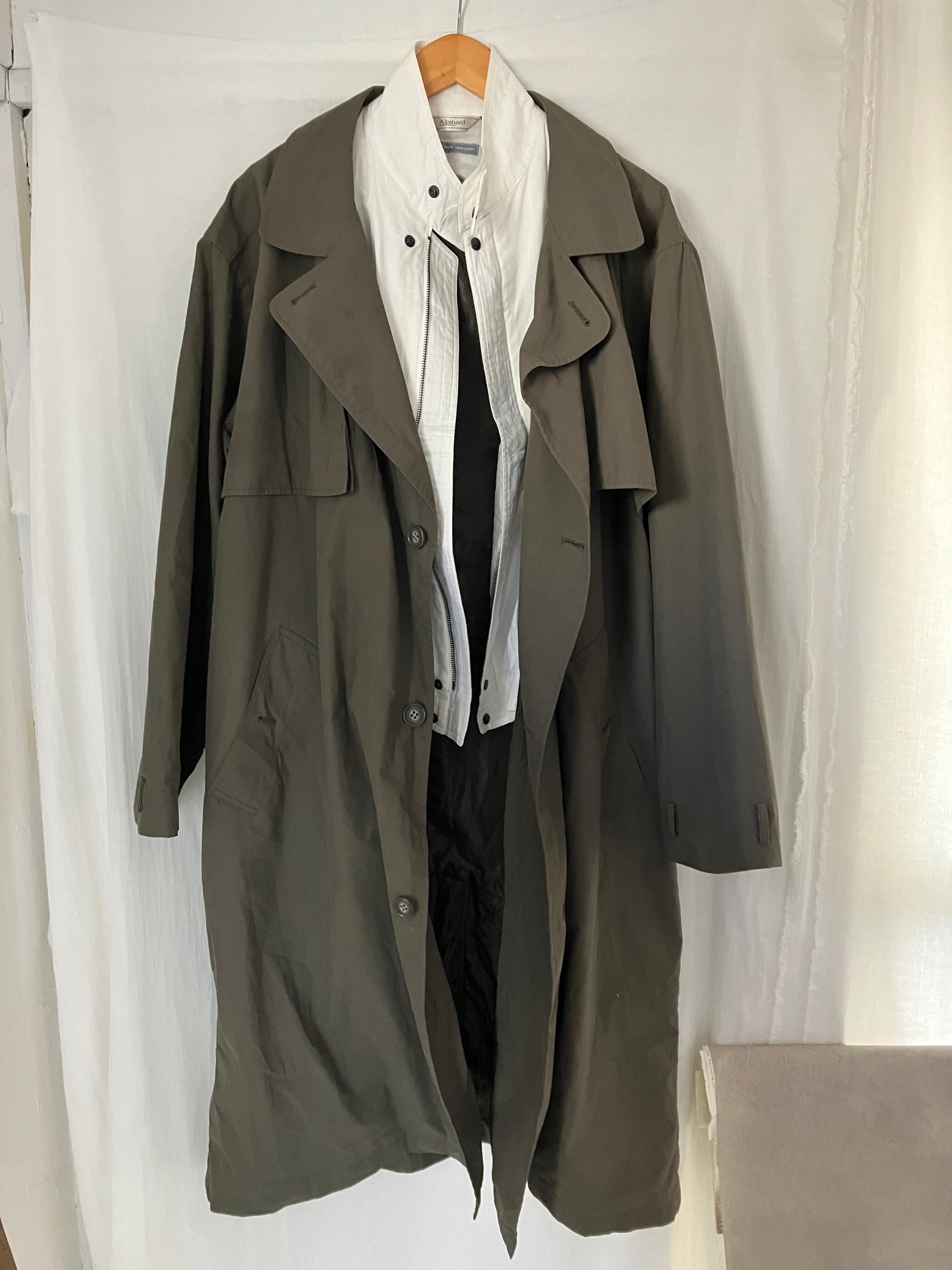カーキのトレンチコートと白のスタンドカラーブルゾンをドッキングした