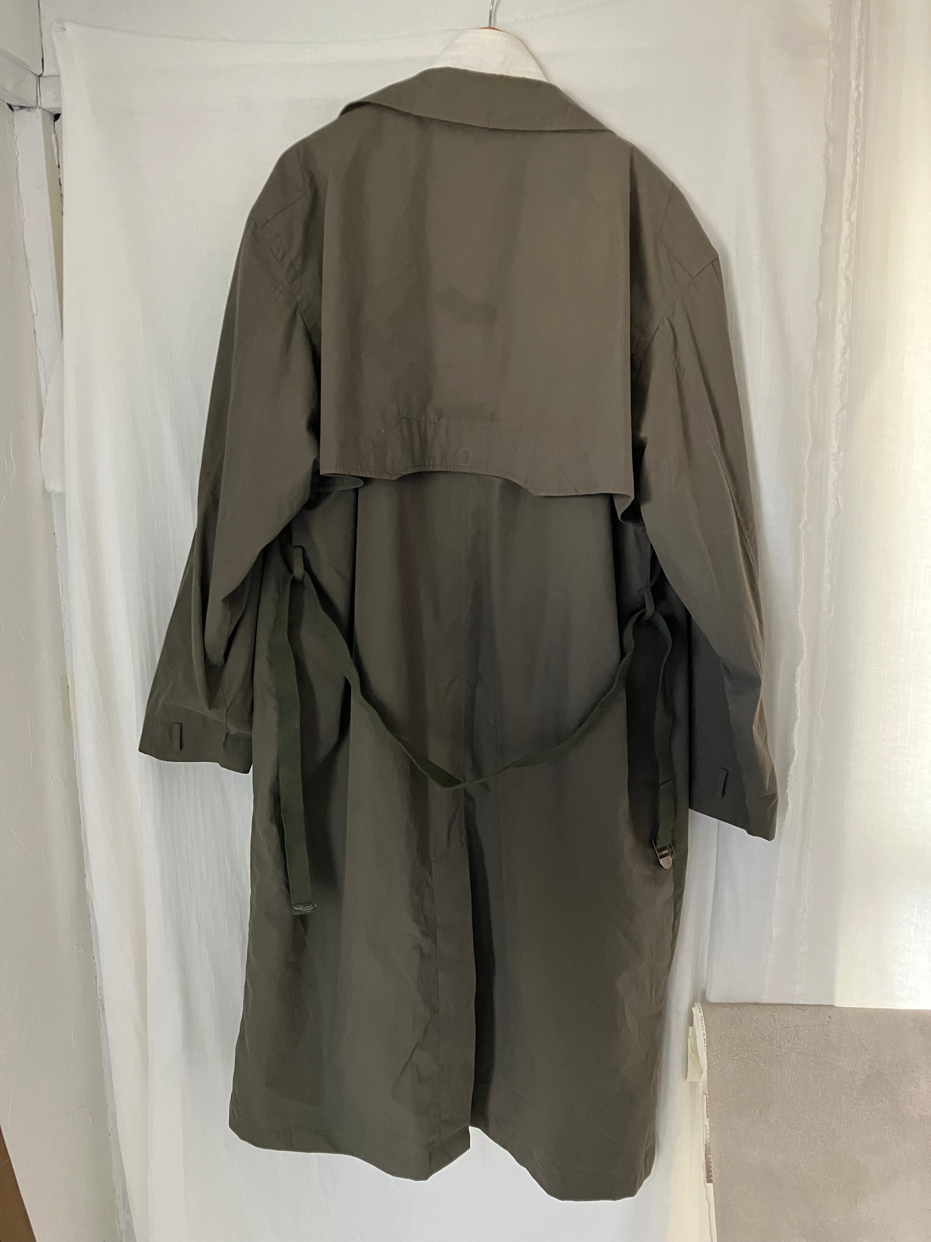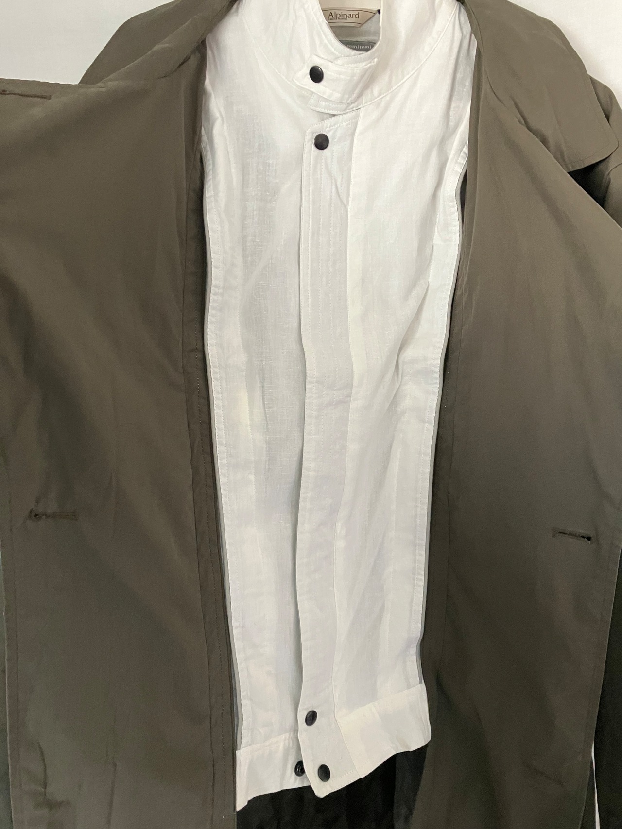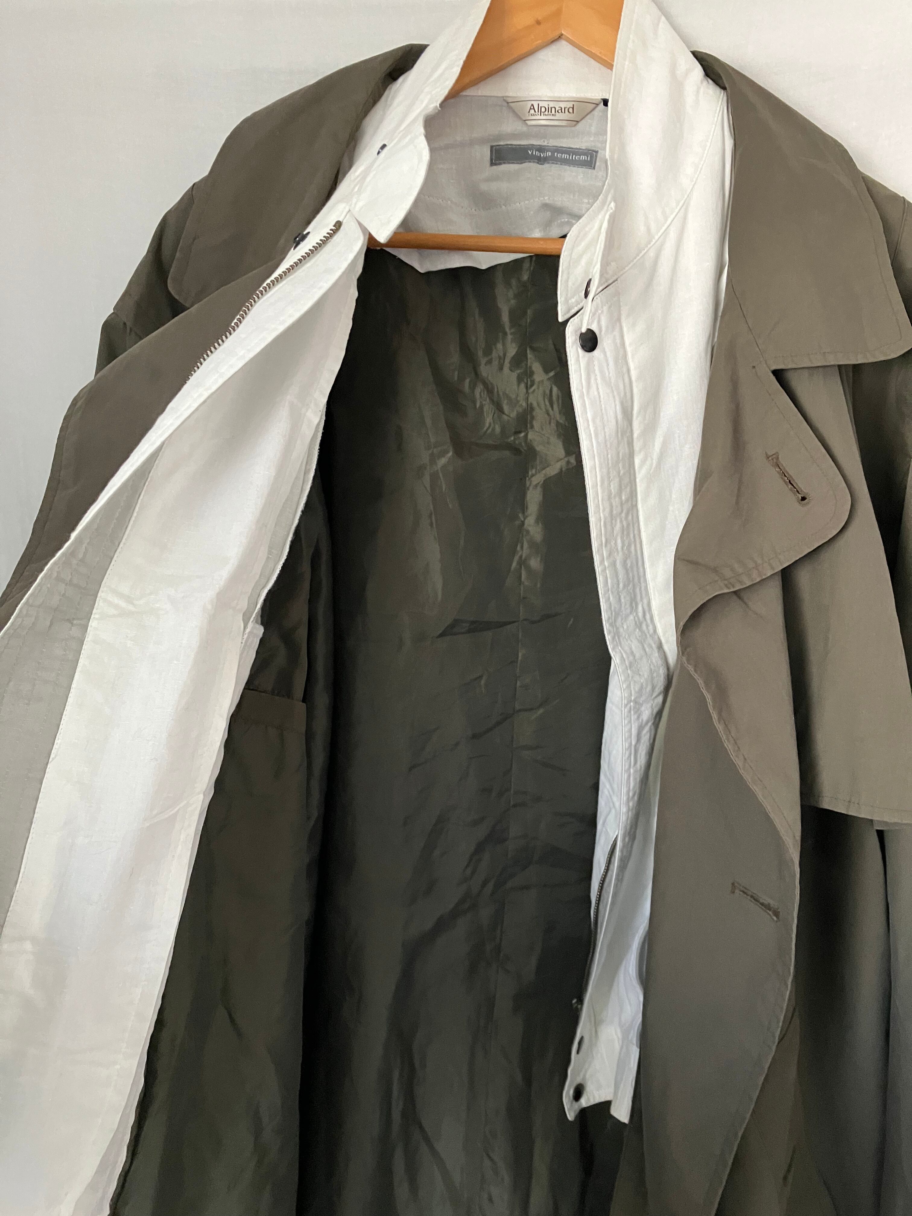 カーキのトレンチコートと白のスタンドカラーブルゾンをドッキングした