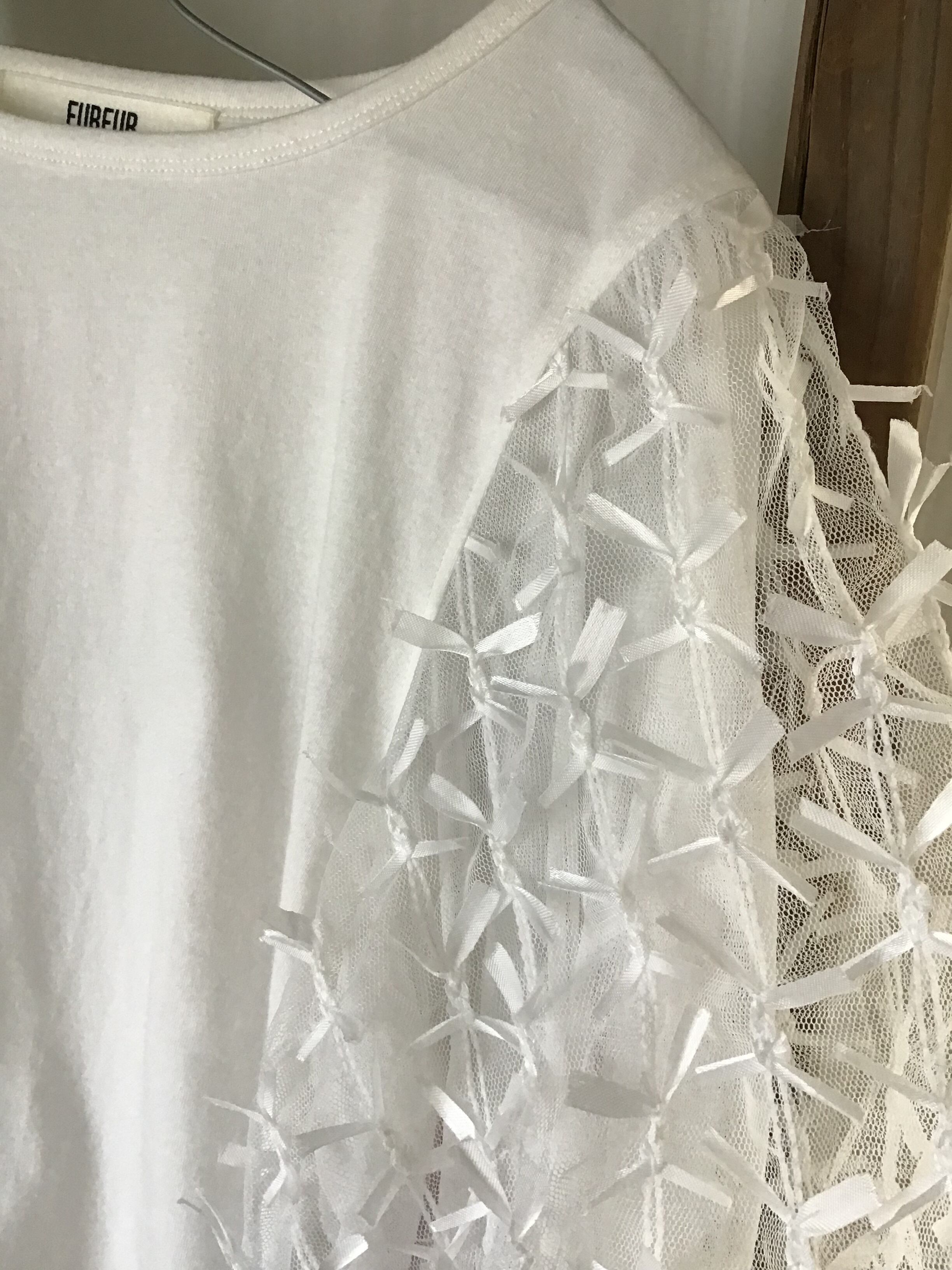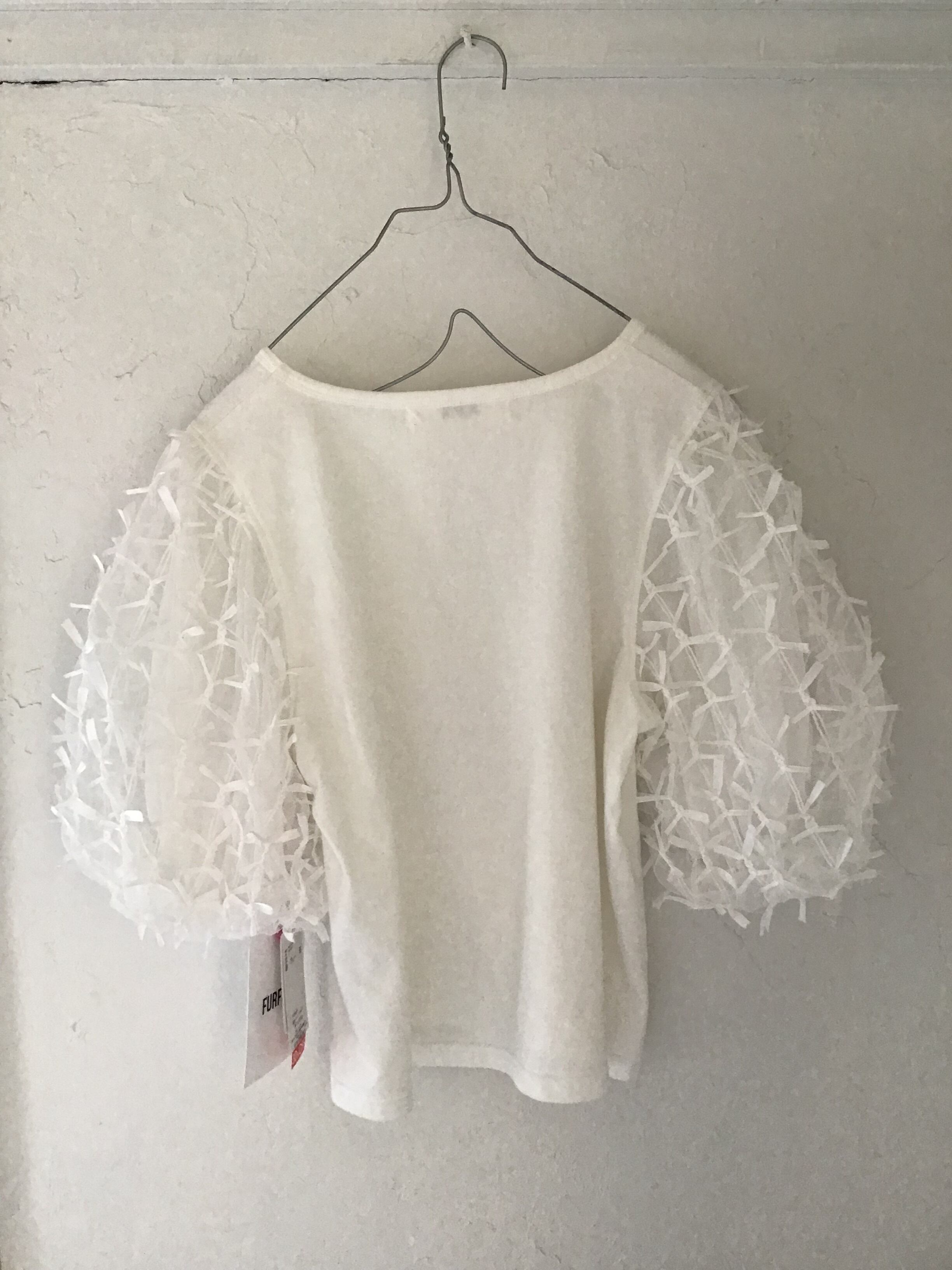 サテンリボンをふんだんにあしらったチュールの袖がポイントの半袖のカットソー。